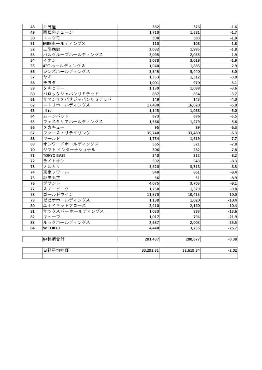 こうした相場展開を受けて、セブツーが選んだ84銘柄は単純合計で8月31日終値は8月1日始値に比べてー0.38%とほぼ変化がなかった。なお、今回からゴルフウェアブランド「マーク & ロナ(MARK & LONA)」を手掛けるキューブ(2022年10月上場)、東京ガールズコレクションの運営などを行っているイベント会社のW TOKYO(2023年6月上場)の2銘柄を先月までの82銘柄に加えて、84銘柄によるランキングになった。なんとその初登場2銘柄のうちW TOKYOはー26.7%で最下位(84位)。同社は6月29日に東京証券取引所グロース市場に新規上場した。上場初値は公開価格3,000円の2.3倍の7,000円だったが、これを最後に株価は下がり続け、公開価格の3,000円を割り込むのではないかという状況に陥っている。一体誰が囃し立てて人気に火を付けたのか。責任は重大ではないか。