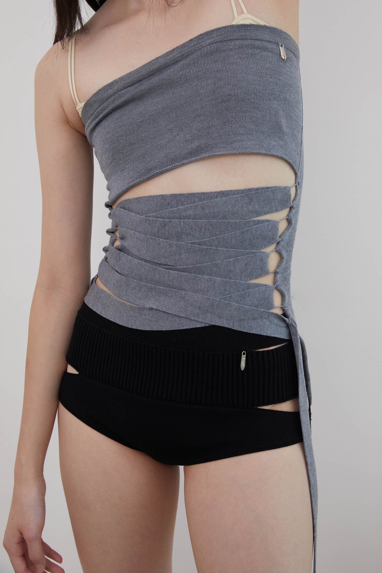 2024年春夏コレクションでは、ネリ・オックスマン(Neri Oxman )が提唱する「マテリアル・エコロジー」から着想。過ち、混沌、共感、喜びといった、思春期から大人への過渡期にも包含されるさまざまな感情を表現したという。 デッドストックのランジェリーレースから発想したというレース編みのニットトップス(3万5200円)やレギンス(3万1900円)もホールガーメントで製作。ボンデージから着想したトップス(3万3000円)、スカート(3万6300円)は、単一素材とシンプルな要素で、流動的な構造とデザイン性を実現した。