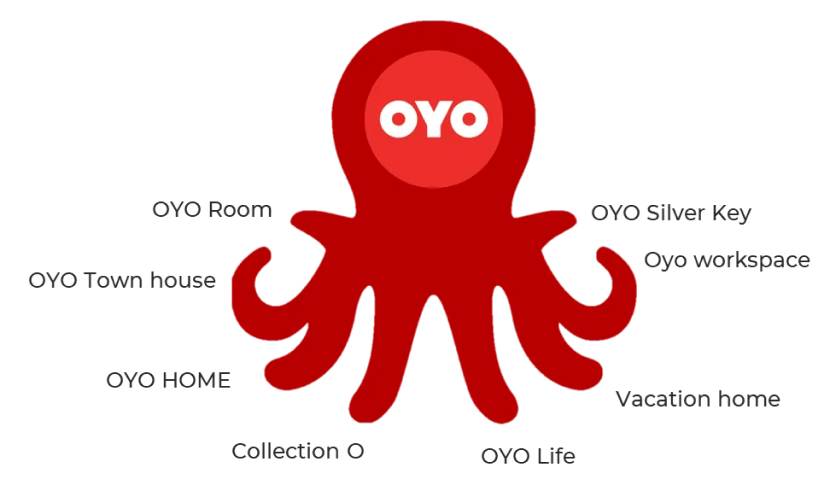 OYOは、ホテル、コワーキング、コリビング、別荘などOYOブランドを冠した多角化戦略を展開する。