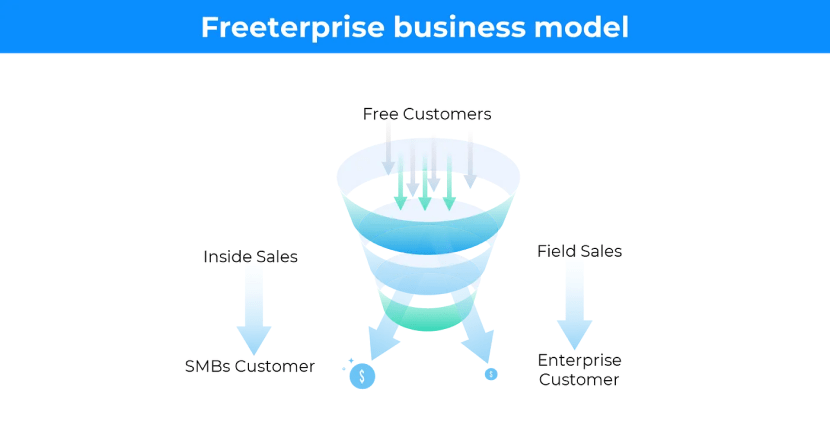 フリータープライズ(無料+エンタープライズ)ビジネスモデルは、最初は無料で導入可能だが、ある一定数人数が増えると課金するモデルである。