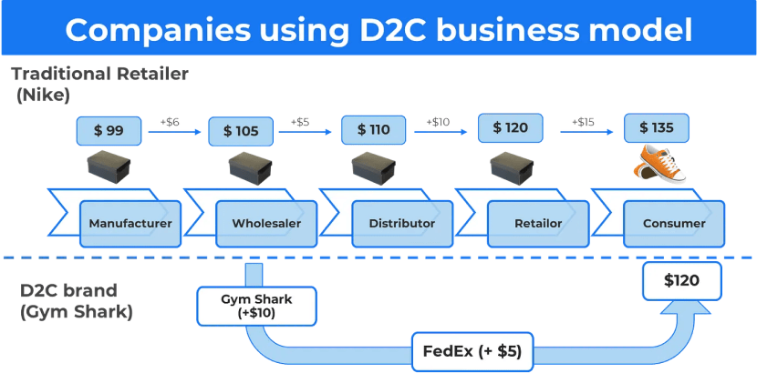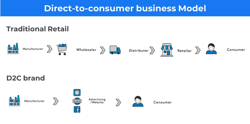 D2Cビジネスモデルを使用するブランドは、ウェブサイト、マーケットプレイス (Amazon、eBay ) などのオンラインチャネルを主に使用するが、実店舗を構える事例が増えている。