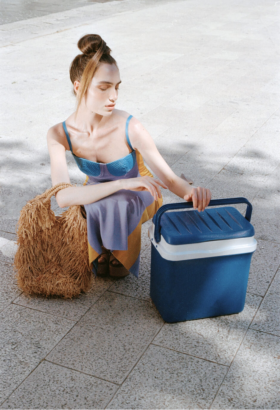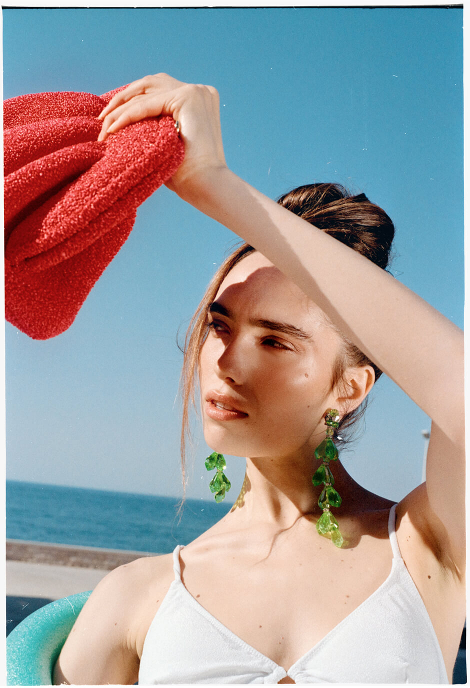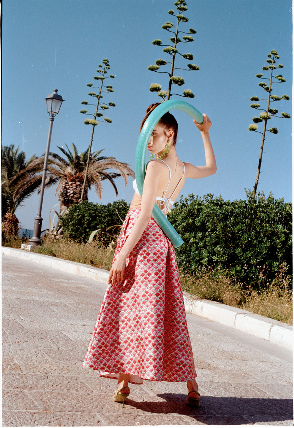 swimwear by COTAZUR, skirt by ALESSANDRO ENRIQUEZ, shoes by ALENA ATTEA, earrings by RADÀ, bag by THEMOIRÈ