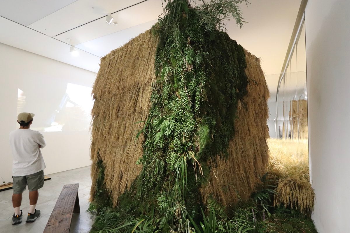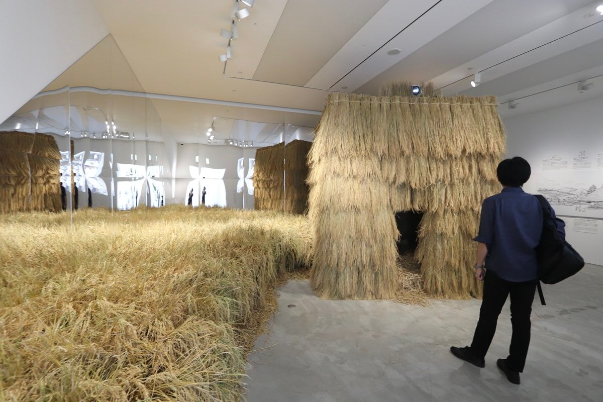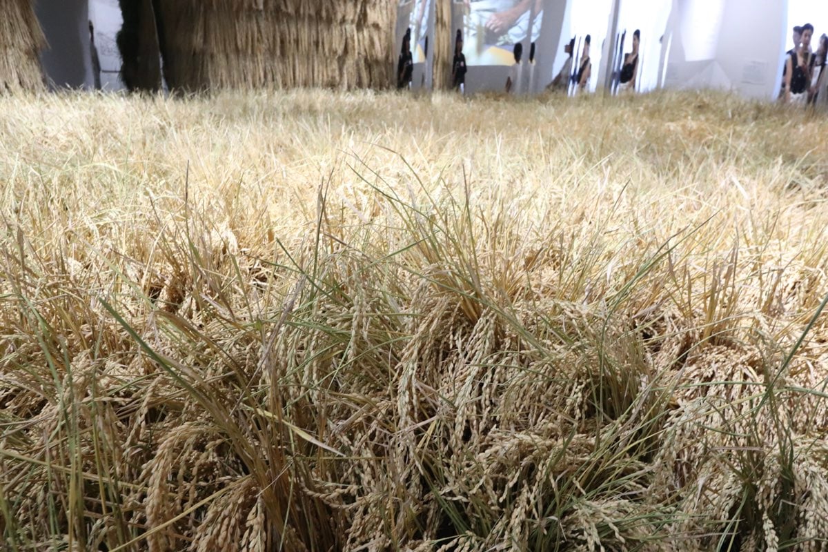 稲は私たちが食べている米やお酒、古くから日本の祭事にも欠かせない植物として文化に浸透している。米として収穫されたあとも、住居の貴重な材料として使われてきたことが分かる。展示のハイライトは展示室に稲を敷き詰めて、“田んぼ”を出現させたスペース。手作業で稲をまとめて、作り上げた空間に圧倒される。