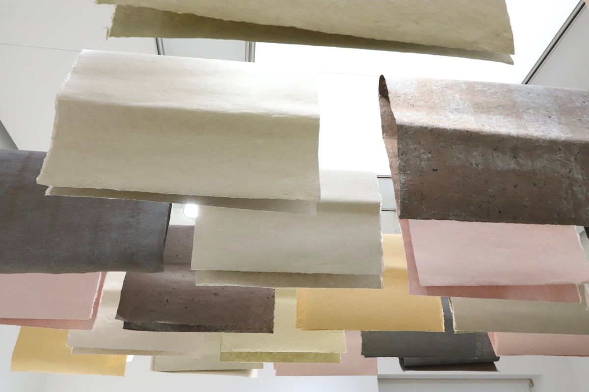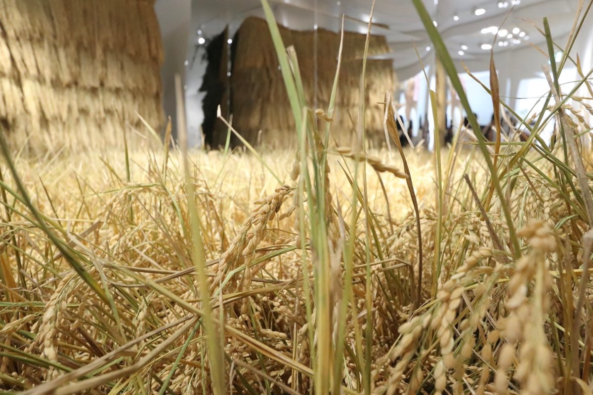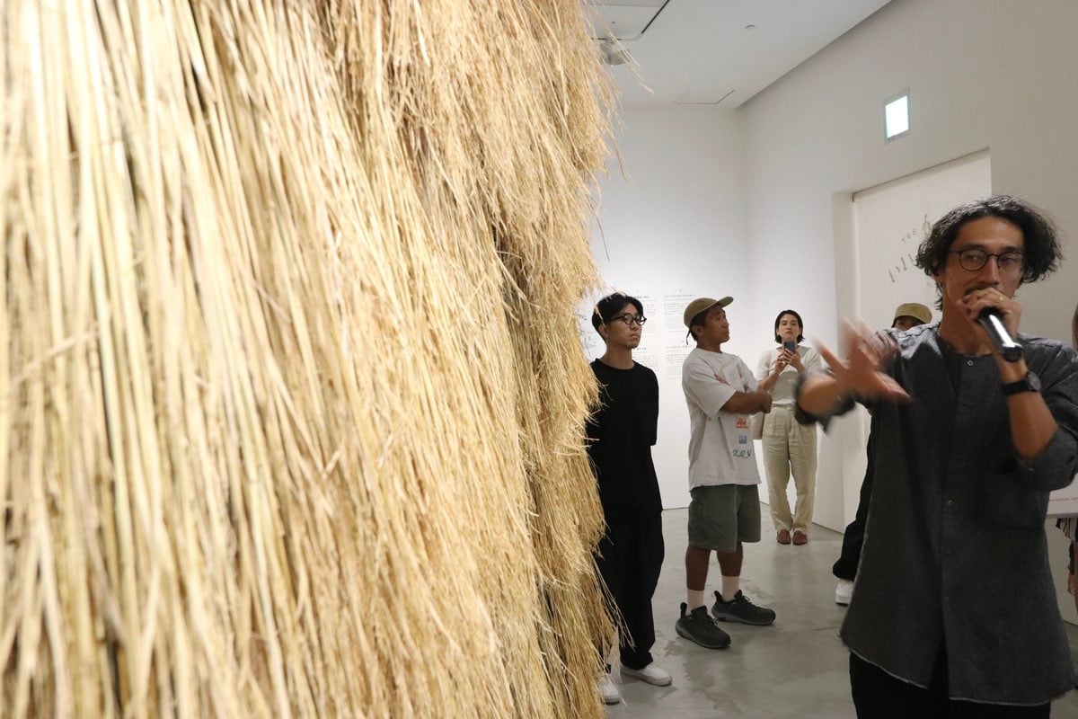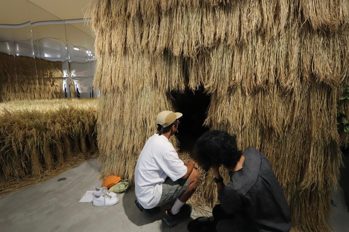 稲は私たちが食べている米やお酒、古くから日本の祭事にも欠かせない植物として文化に浸透している。米として収穫されたあとも、住居の貴重な材料として使われてきたことが分かる。展示のハイライトは展示室に稲を敷き詰めて、“田んぼ”を出現させたスペース。手作業で稲をまとめて、作り上げた空間に圧倒される。