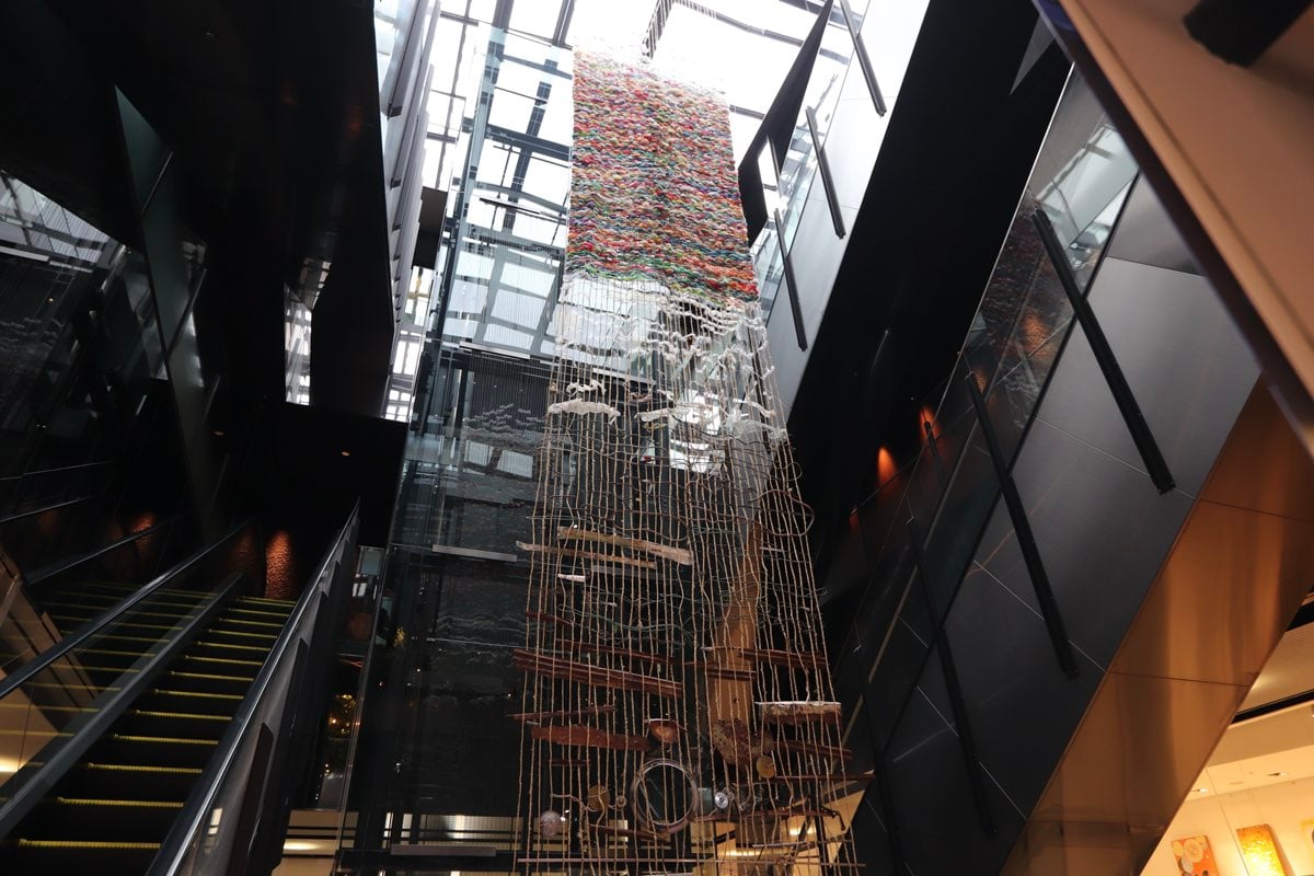 GYREに掲げられた巨大なタペストリーは相良さんによるもの。稲藁を使い文明の発展と、その先にある明るい未来を表現している。上に行くたびに近代的なマテリアルを編み込んだ、本展示を象徴する創作物である。