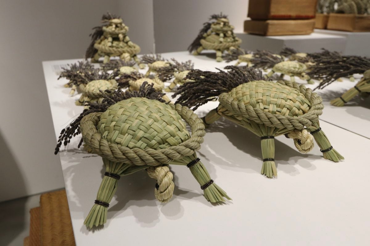 愛媛のしめ縄職人・上甲清さんによる藁細工。稲藁作りから当初はひとりで行っていたそうで、現在はお孫さんと2人で制作をしている。その模様が会場内で上映されている動画でも確認できるのでぜひ足を止めて観てほしい。