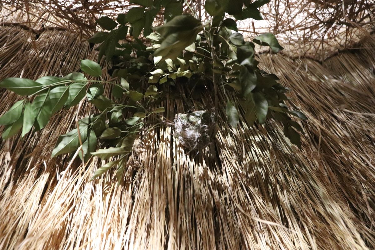 茅葺の家の天井にはさりげなく、鳥の巣が。家と巣。「イエス」なイースターエッグにほっこり