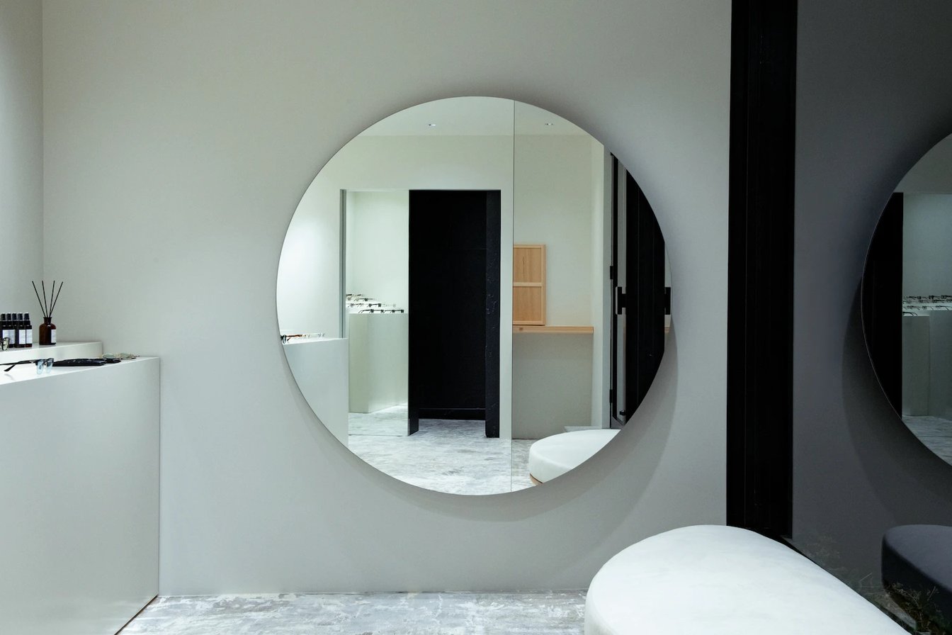 フィッティング用の鏡も実は正円ではなく、少し折り曲げられ、不完全な円になった月に見立てている。コンセプチュアルなストーリーは鏡にまで息づく