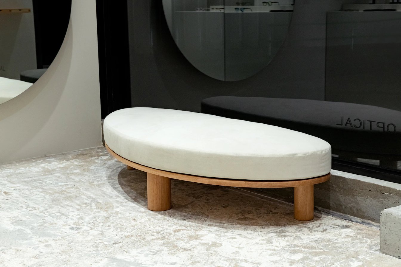 「ショップは、建築家の橋村雄一さんに設計をお願いしました。ブランドコンセプトの“十三夜の月を愛でる”からインスパイアされ、縁側に座って月を眺める庭の景色をイメージしています。楕円形のソファーは石、正円ではない円形のミラーは月を見立てて設置してあります」