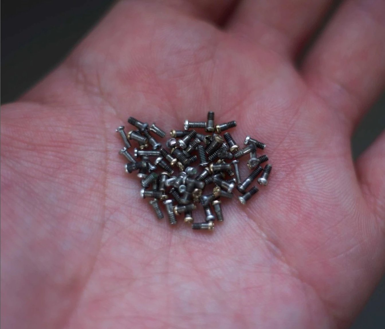 ネジは小さなパーツですが、眼鏡づくりに欠かせない重要な存在。フレームとテンプルを繋ぐ蝶番の支えは他でもない、このネジなのだ