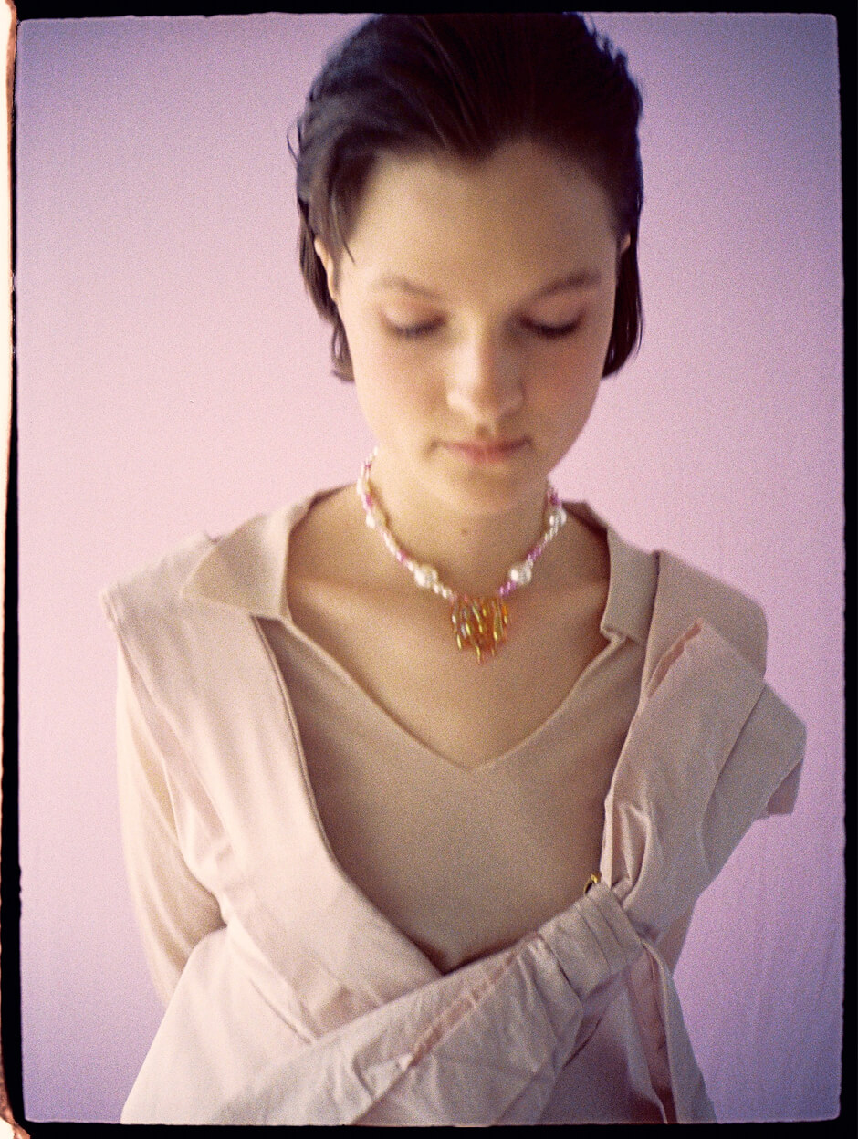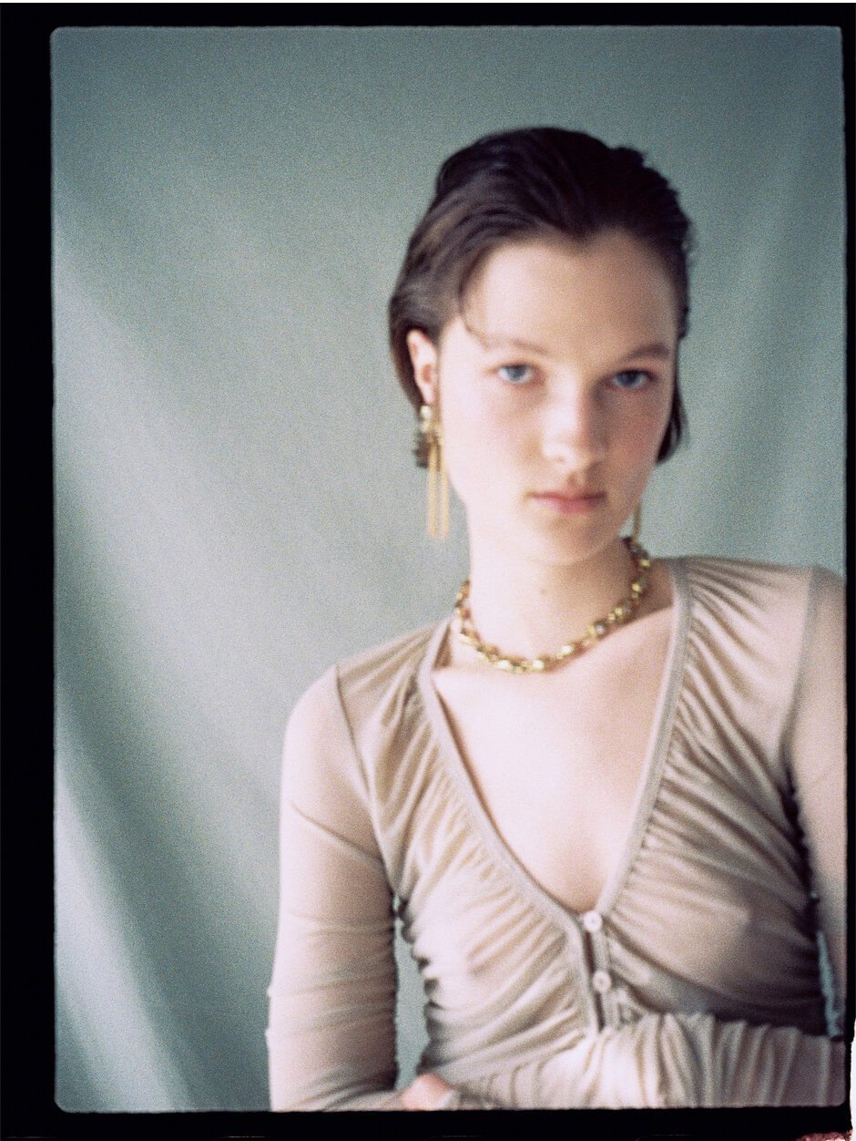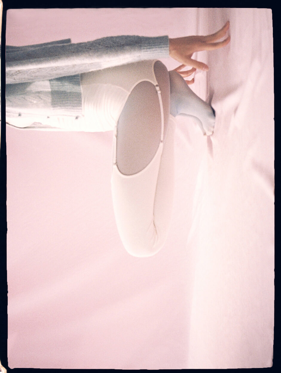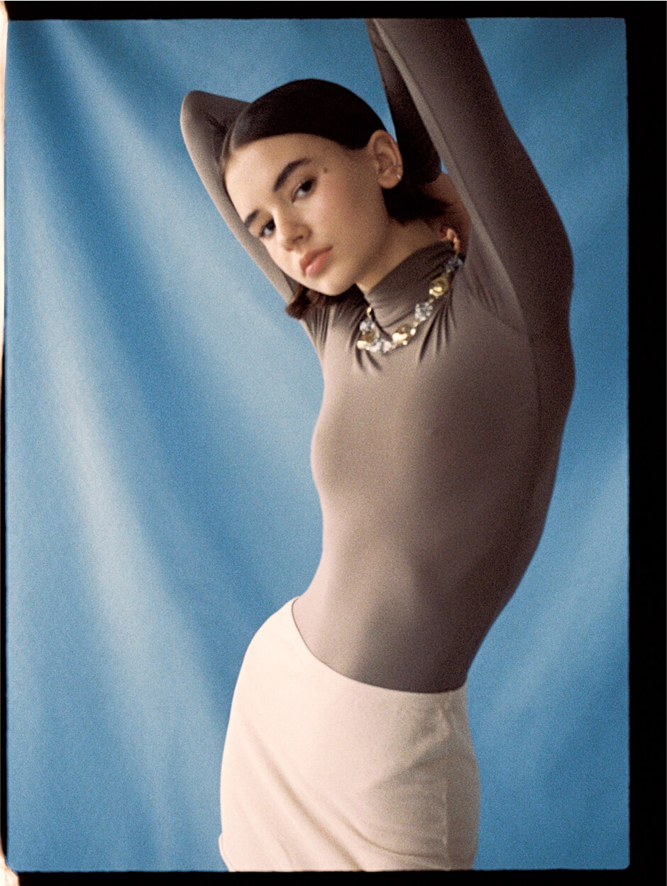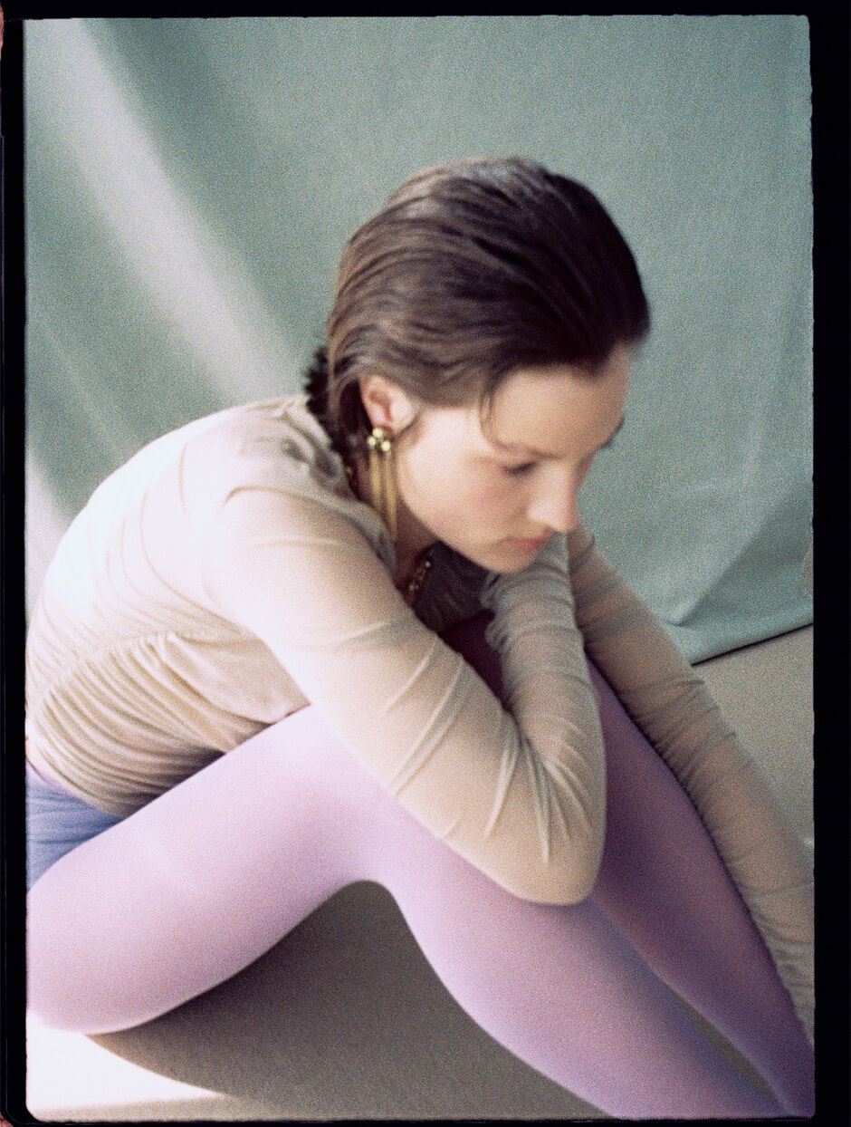 top by JEMAPERLE, necklace by PETITEA, bra, shorts, tights and leg warmers stylist’s own