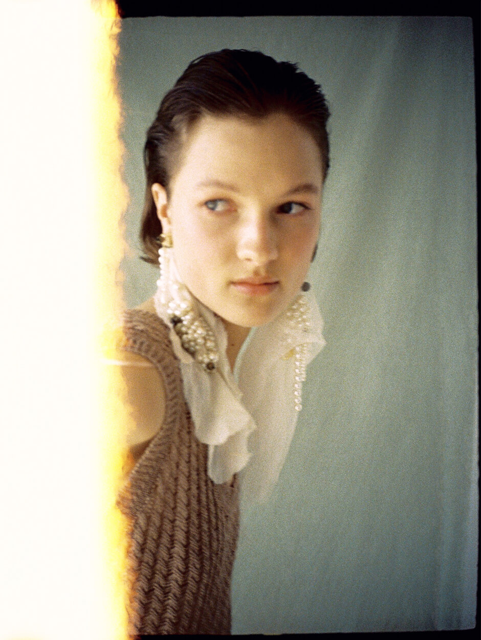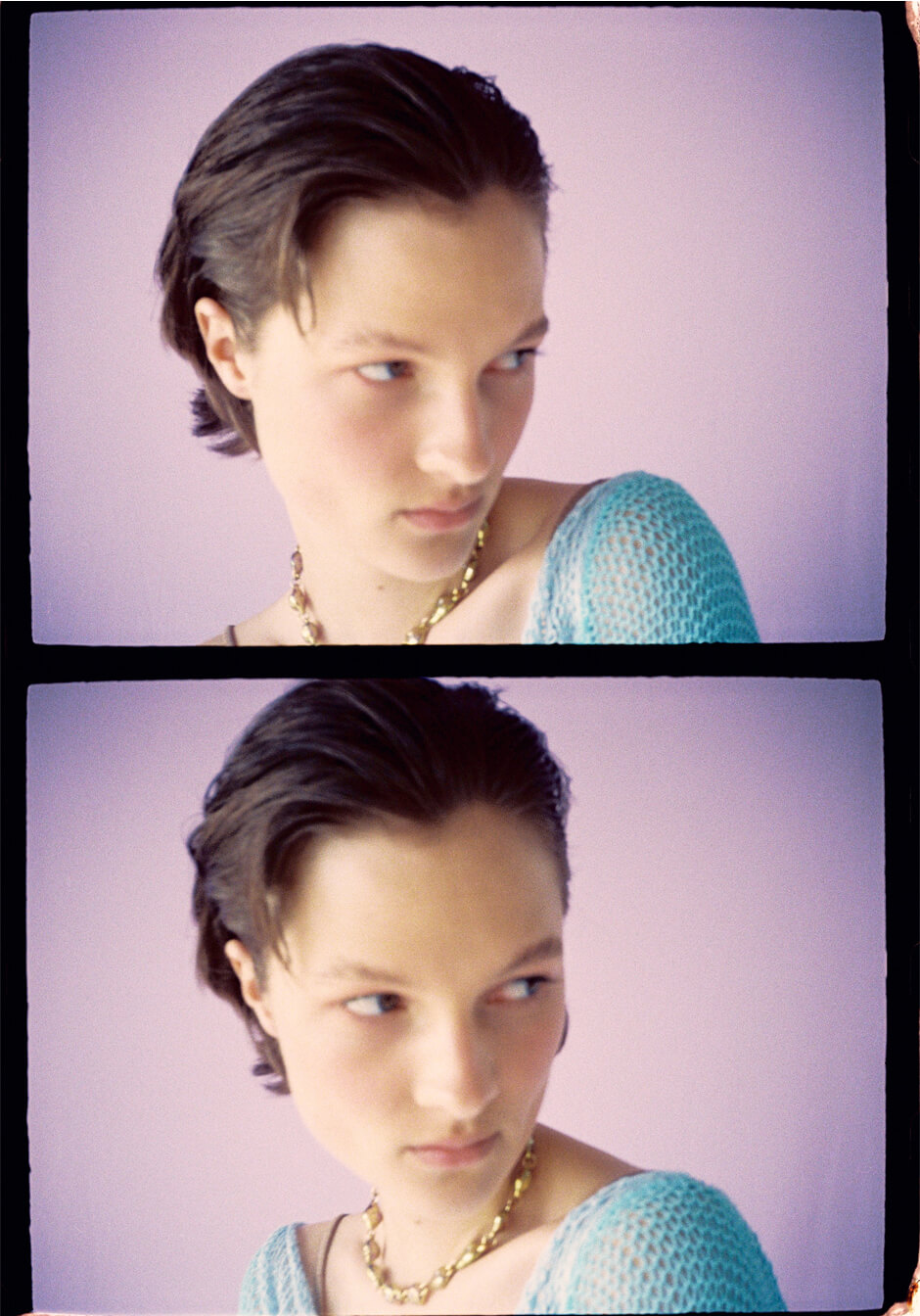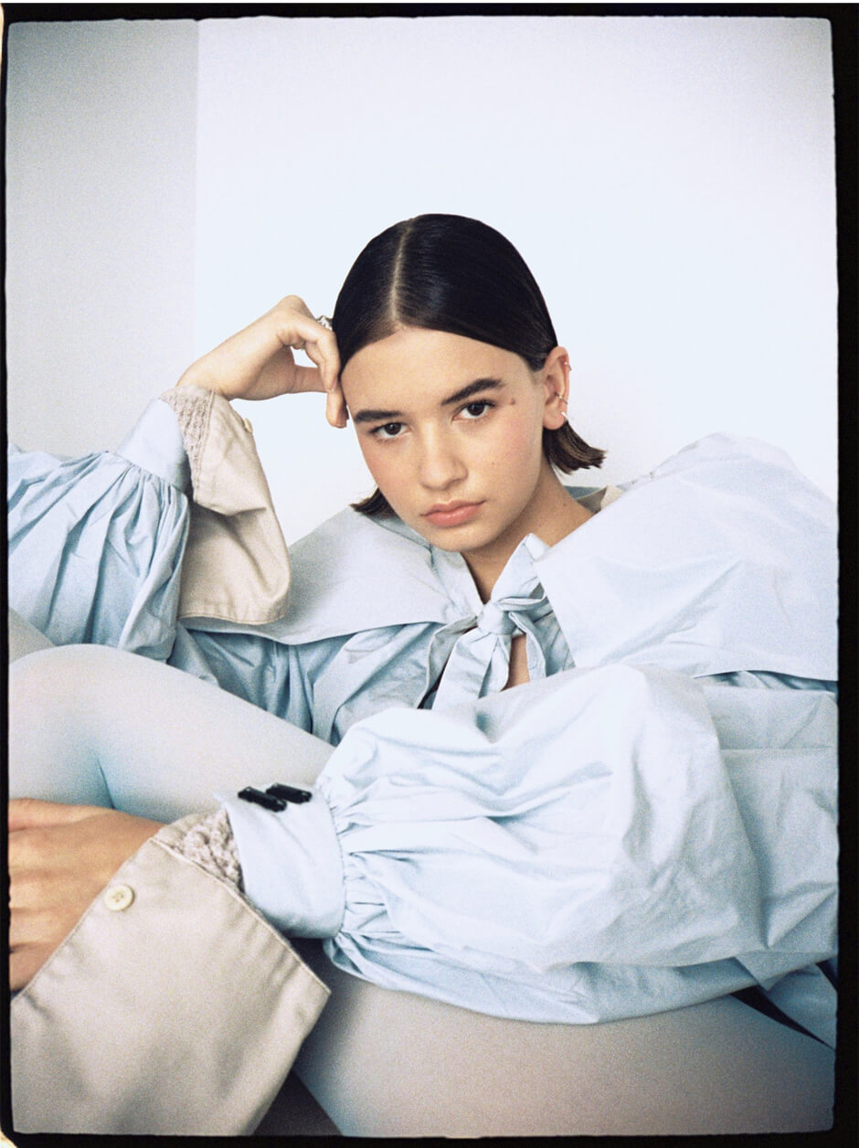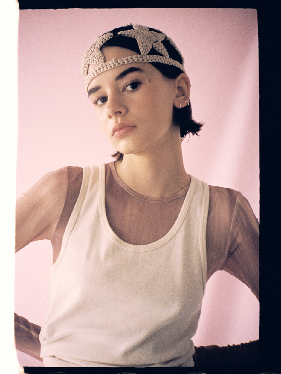 top by JEMAPERLE, necklace by PETITEA, bra, shorts, tights and leg warmers stylist’s own