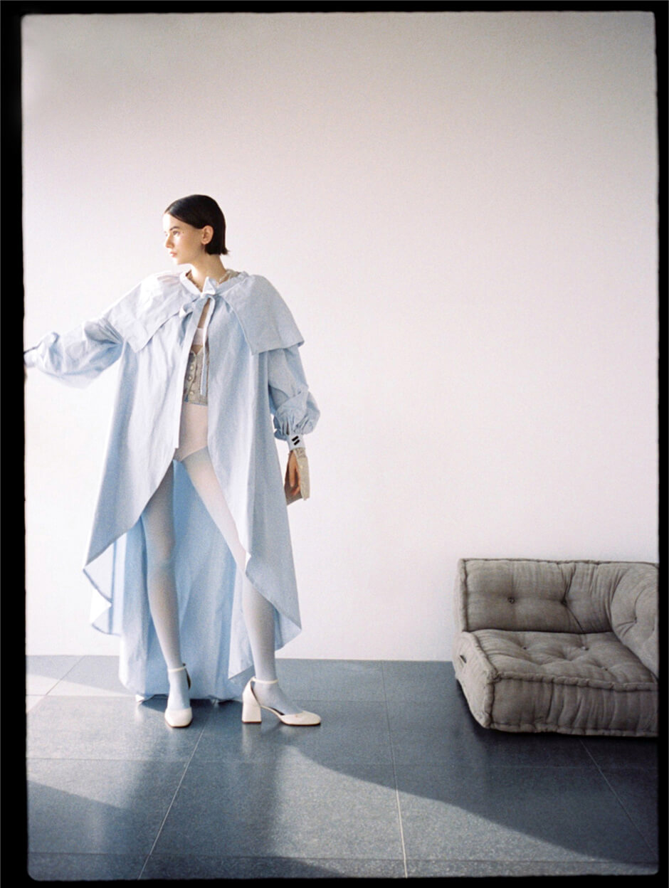 coat by STELLA KULL STUDIO, top by ÁPEIRON, bra and shorts by TALK UNDER LIGHT, earcuff and ring by PETITEA, tights and shoes stylist’s own