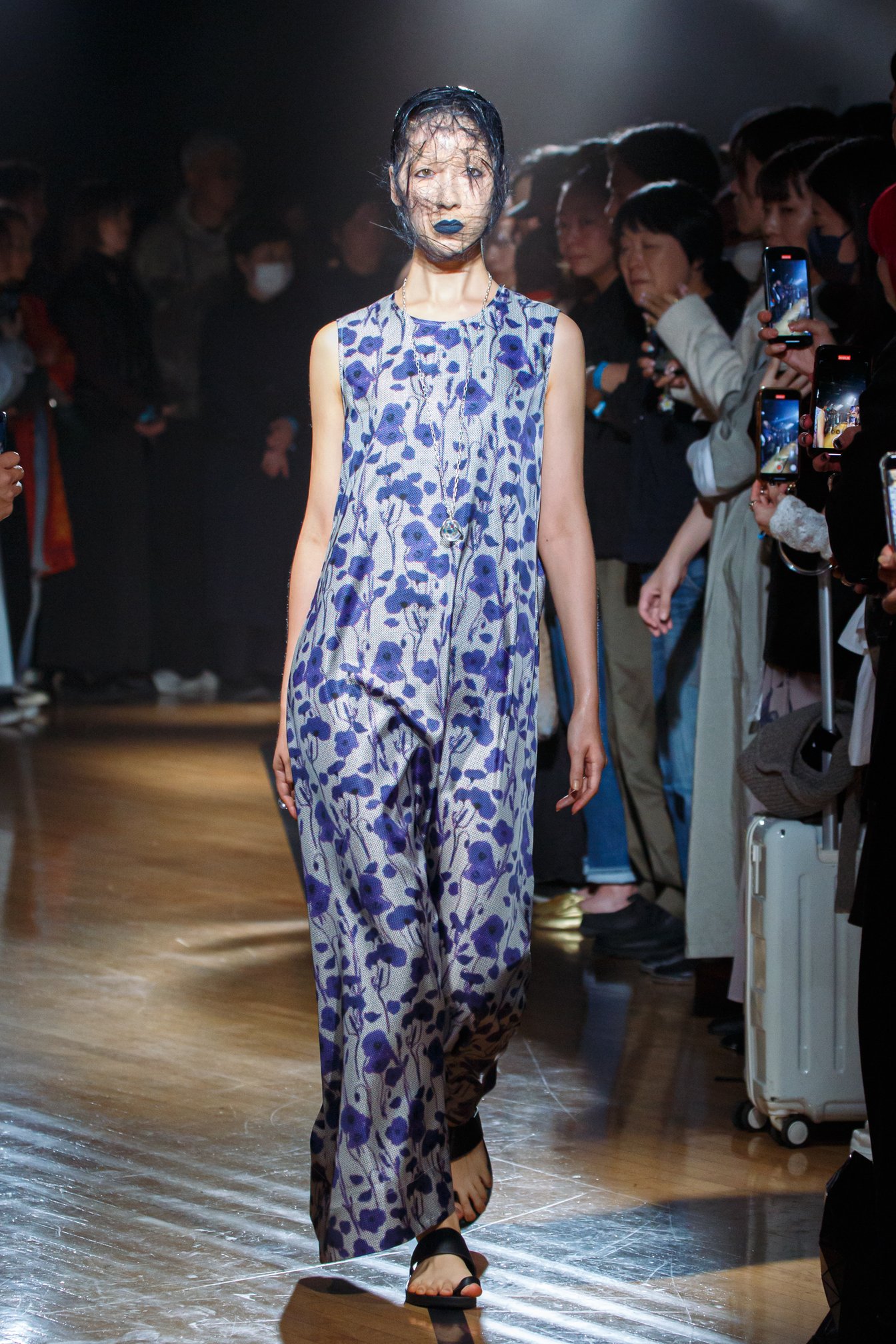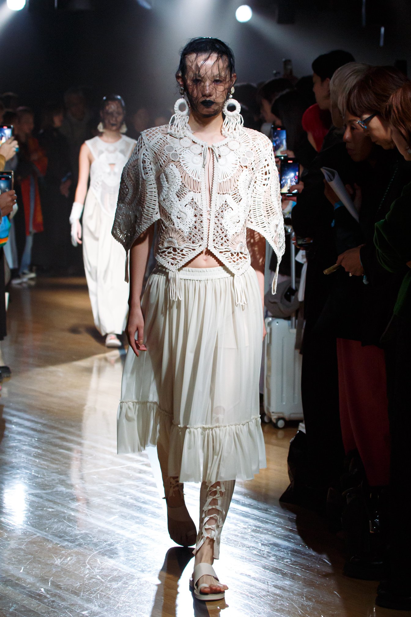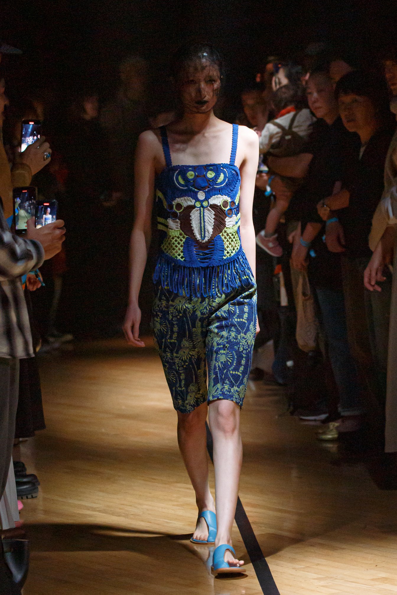 暗転した会場に、ハイヒールの靴音が響き渡りショーはスタート。ステージの暗幕の中から登場したモデルたちは、人混みをかき分けるように敷かれた細く曲がりくねったランウェイを歩く。2024年春夏コレクションのテーマは「islanders(島民、島の子)」。「民族」という言葉の持つ固定概念を振り払い、架空の島で暮らす民族や生き物の「不気味だが愛がある姿」を表現。自身のイラストで絵本のような物語を作り上げ、そのイメージを落とし込むようにコレクションを構築したという。「架空の自由な世界には、ヒールを履いている民族がいたっていい」という思いから、時折響くハイヒールの音を演出に加えた。自分たちが考えていることが全てではない、という想いを裏テーマに添える。