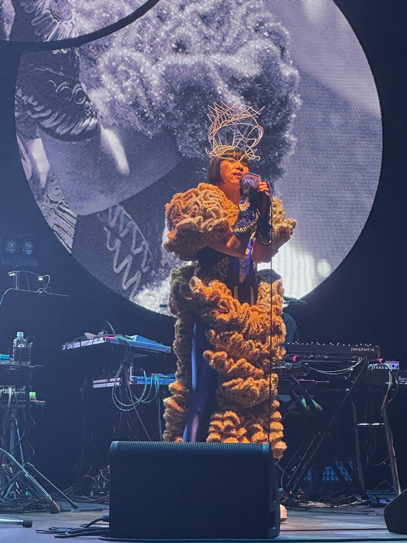 モデルたちがステージの暗幕の裏に帰っていくと同時に幕が開きUAのライブがスタート。「情熱」をはじめとする人気曲を数曲披露した。UAが着用した、ケイトウの花のようなゴールドのニットパーツを組み合わせたドレスは全てオリジナル。細いラメ糸を31玉を田中自身が1人で編み上げた。「架空の島の姫」をイメージしながらも、単純な可愛らしいデザインになってしまわないように度重なる調整が重ねられ、ショー直前の5日間眠らずに編み上げたという。