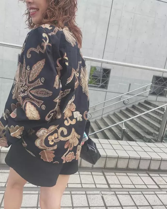 襟ぐりがボタンを閉めても広めなところ、そしてビッグシルエットすぎない点、そして品のある刺繍デザインに一目惚れしました。サイズ感がぴったりなのと、ウエスト部分のくびれがなく、ヴィンテージのジャケットにはあまりないストレートシルエットなところも気に入っています。
