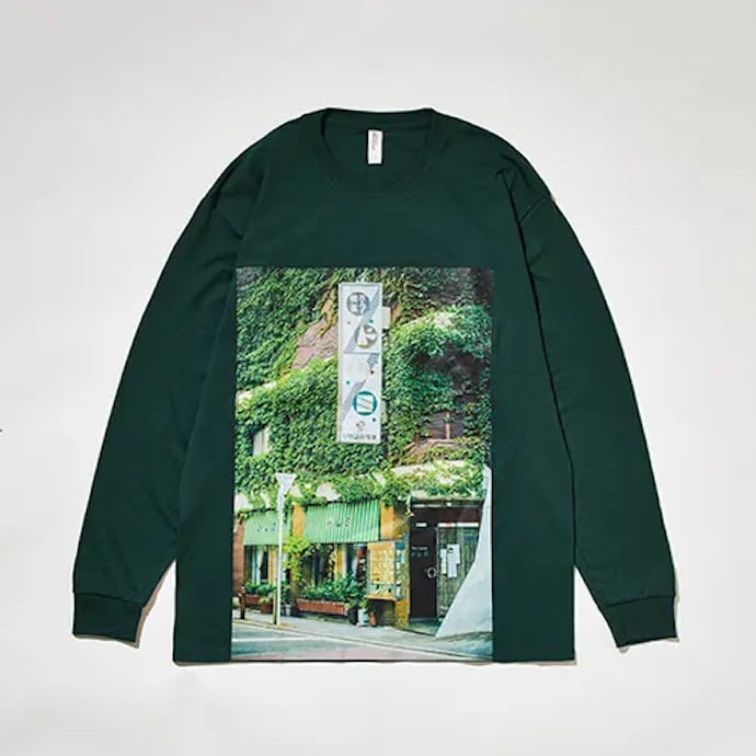 「フォトプリントロングスリーブTシャツ」(税抜1万円)は、大阪・浪速区にある『喫茶ドレミ』の外観を大胆にプリントしたアイテムです。