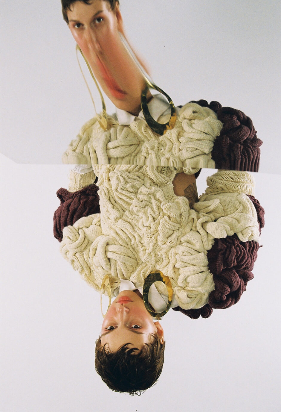 スタイリストのSofiaが探究するコンブチャレザーの開発は、「セルフ・カニバリズム」のメタファーとして機能します。