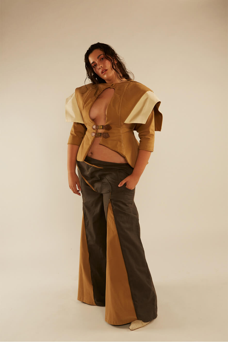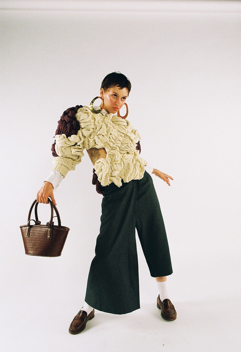 top by S.STUDIO, shirt and trousers by LEMĀCHET, shoes by SABAGO, earrings by FERNANDO RODRIGUEZ, bag by JACQUEMUS, socks stylist’s own
