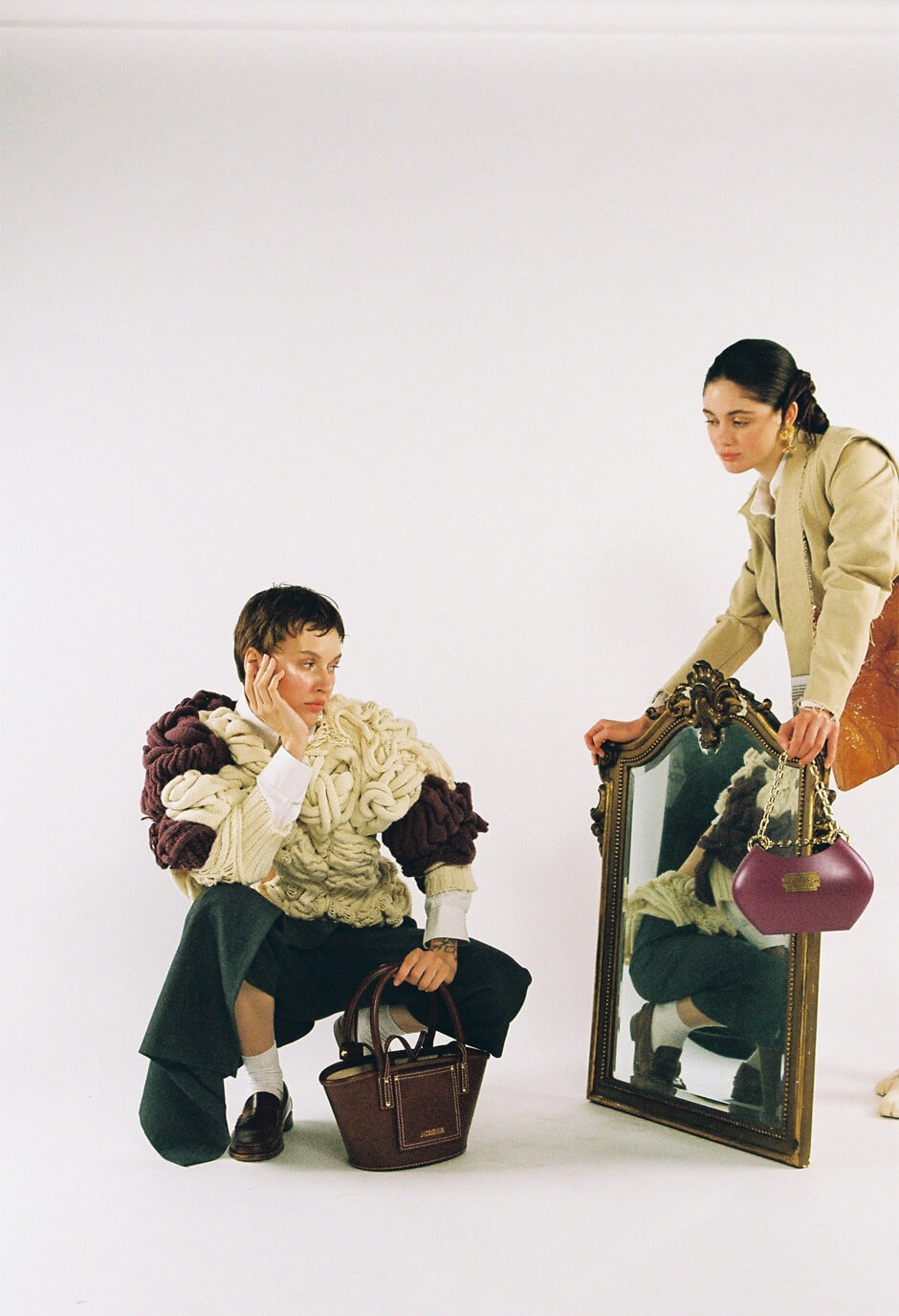 left - top by S.STUDIO, shirt and trousers by LEMĀCHET, shoes by SABAGO, bag by JACQUEMUS, socks stylist’s ownright - jacket by CASSUM, top by S.STUDIO, shirt by LEMĀCHET, shoes by MAISON MARGIELA, earrings by CLAIRE DEVE, bag by ÁLVARO CLAFAT