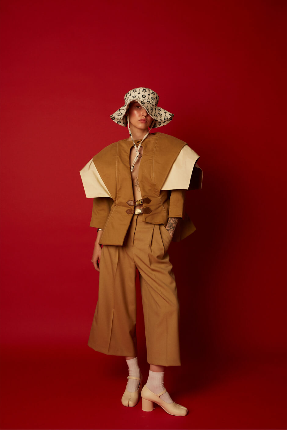 jacket by S.STUDIO, trousers by MARNI, shoes by MAISON MARGIELA, hat by ÁLVARO CLAFAT, socks and bangle stylist’s own