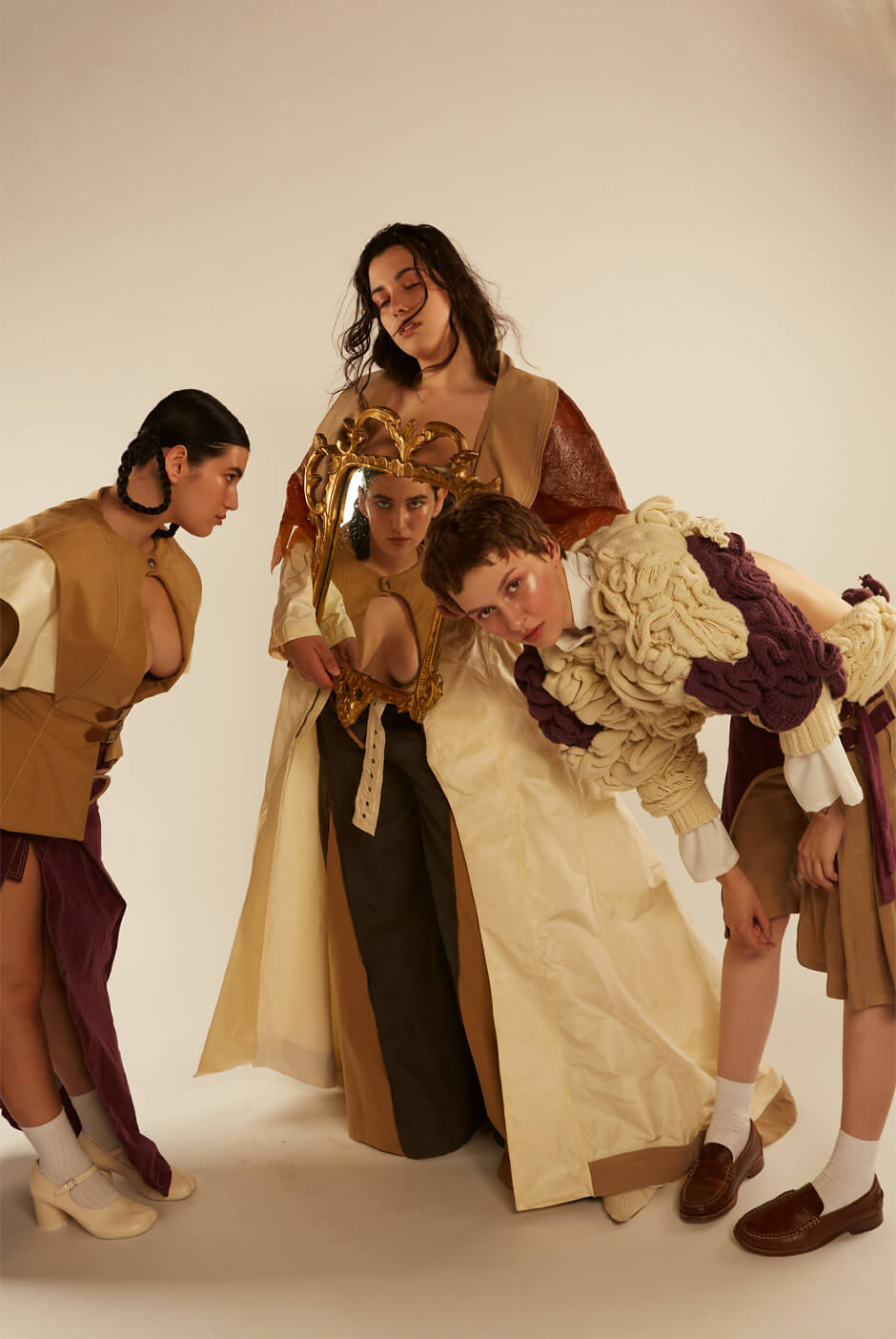 from left - jacket and skirt by S.STUDIO, shoes by MAISON MARGIELA, socks stylist's own,coat, trousers and shoes by S.STUDIO,top and skirt by S.STUDIO, shirt by LEMĀCHET, shoes by SABAGO, socks stylist’s own