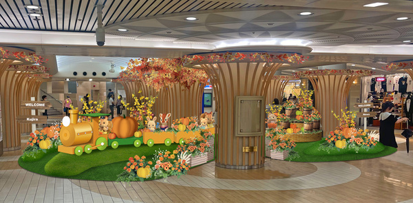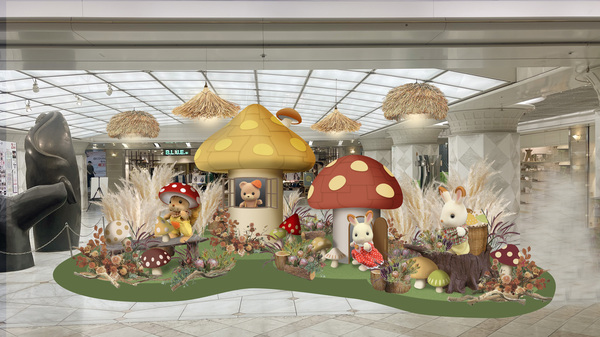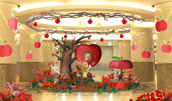 実りの秋を迎えるこの時期、シルバニアファミリーの仲間たちが実りの秋をイメージした装いで迎えてくれる。今回の装飾施工は、サンテックスが担当する。