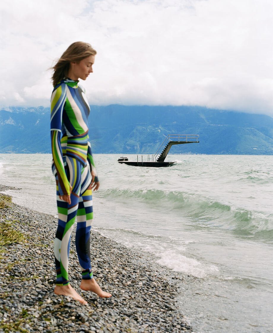 coat by BLUEMARBLE, swimwear by ERES, socks by FALKE, shoes by CELINE BY HEDI SLIMANE