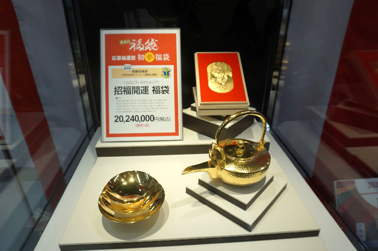 堅調な高額品消費では大丸東京店が9匹の竜が彫刻された水晶(1億円、1個限定)を用意する。東武百貨店池袋店は金製品やアートのサブスクリプション(定額課金)の福袋を出す。金は竜が彫られた大判と銚子(ちょうし)、杯のセット(2024万円)で、資産として親から子へ受け継いでもらうように企画した。アートのサブスク(100万円)は美術画廊の人気作家から、好きな作家を1人選んで絵画を楽しめる。オリジナルの作品を描いてもらって、年4作品が届く。福袋の店頭販売は1月2日から。