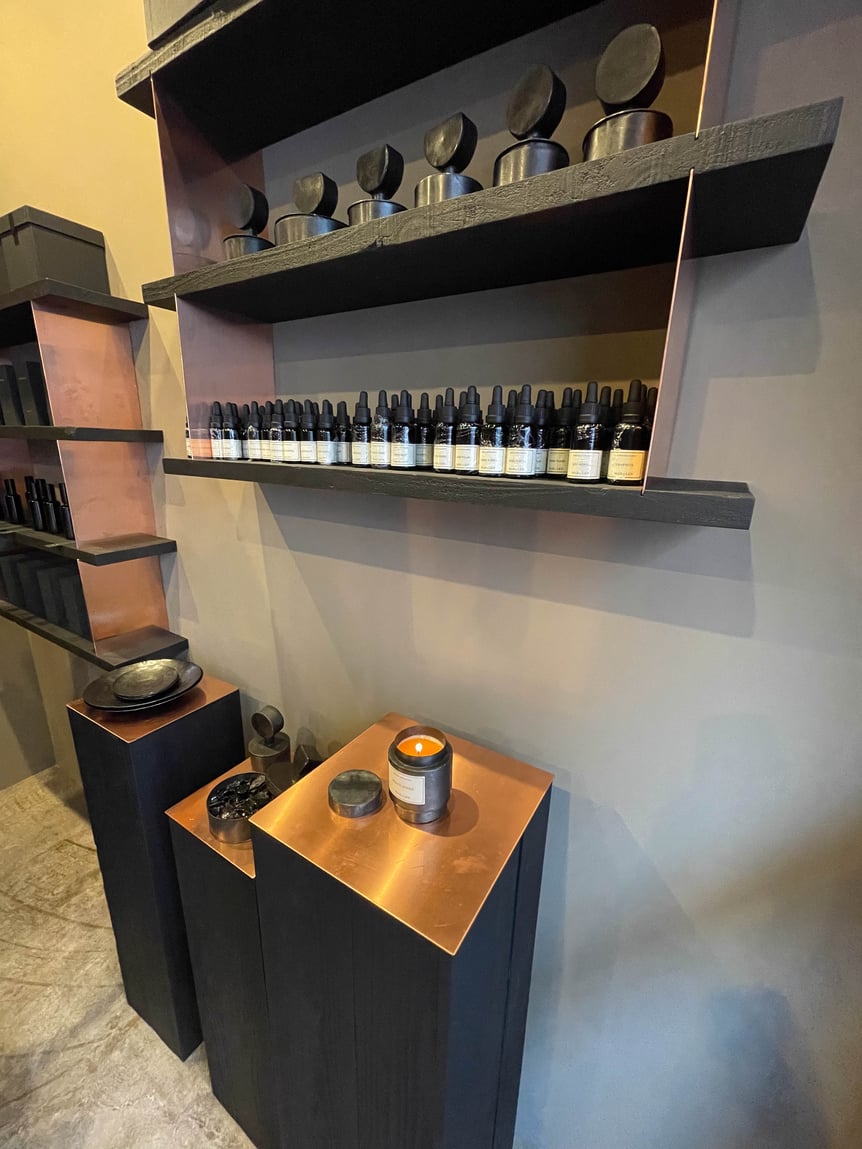 店内は、日本にローカライズした素材を積極的に使用しトラディショナルな要素を散りばめた、パリの本店とも違うユニークな雰囲気を演出。グレーを基調に、退廃美を表現した什器を不均等に並べ、鉄や木材の経年変化が楽しめるような作りに仕上げた。侘び寂びや禅の心などの日本らしさを取り入れ、フレグランスブランドでありながら、他感覚的に楽しめる空間としている。ブランドが大切にする「手仕事」や「生々しさ」を体現する、過剰に整うことを拒んだ不完全な世界観が特徴だ。