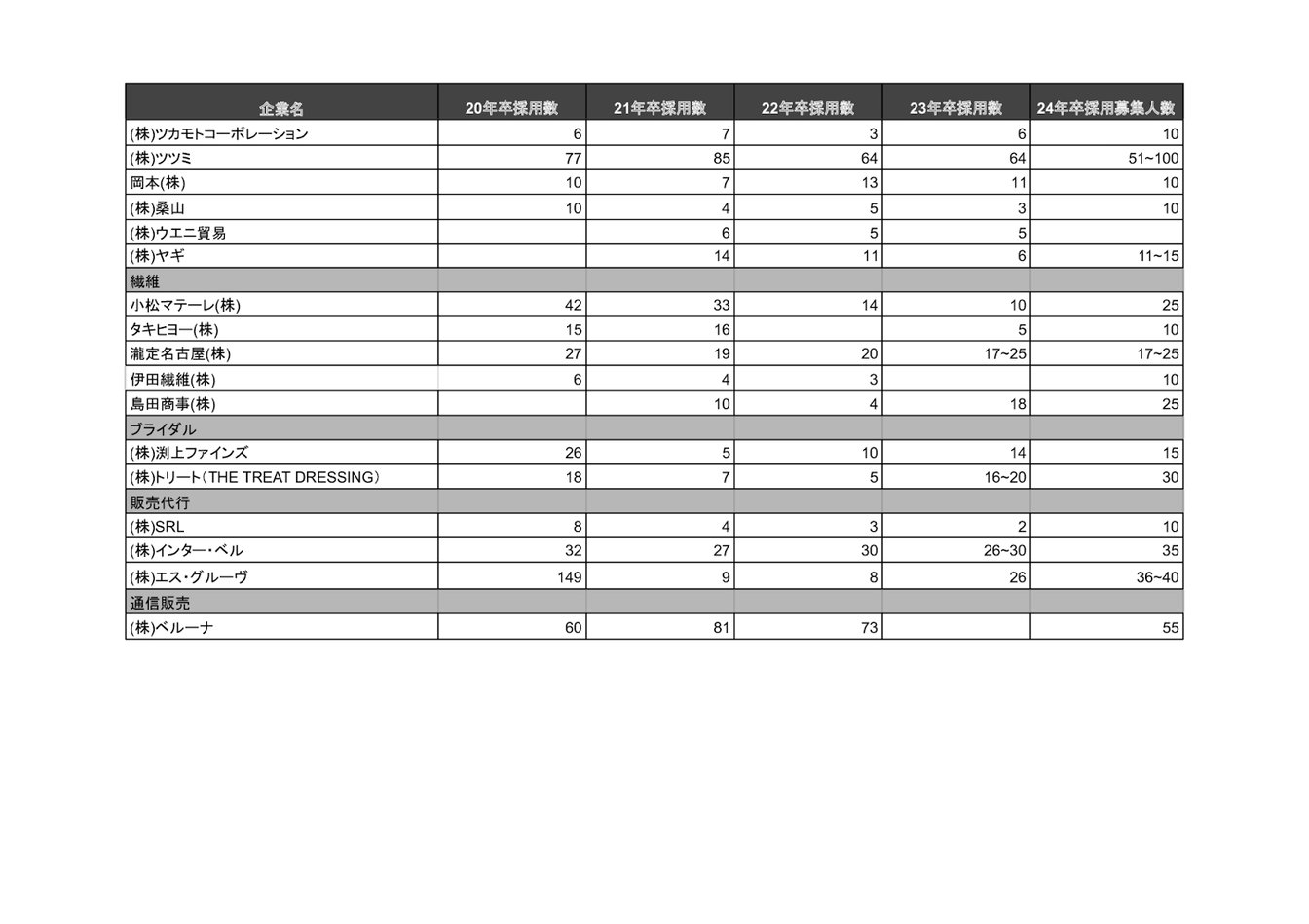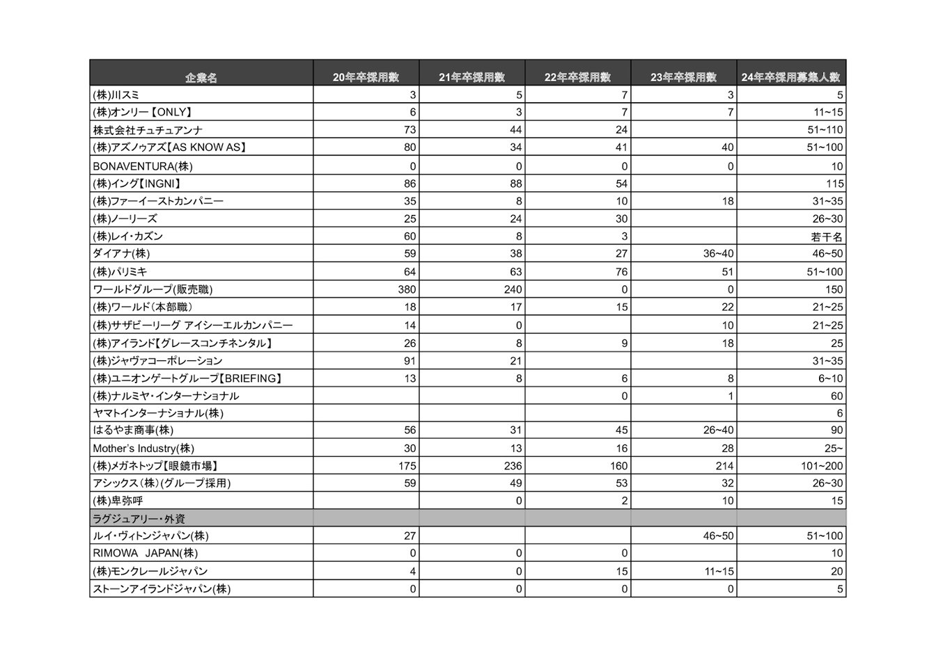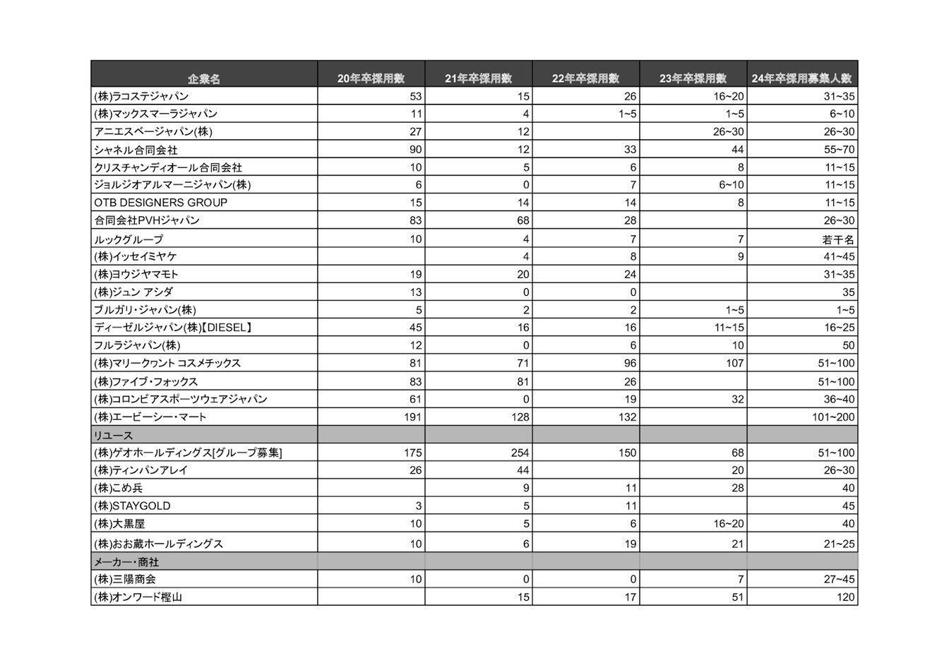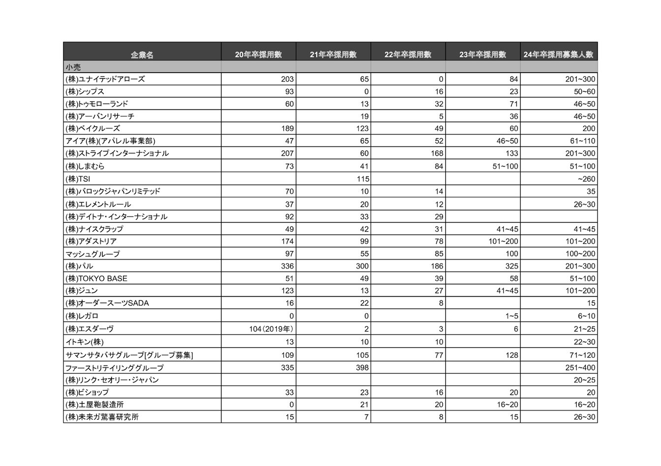 株式会社アダストリアや株式会社トゥモローランド、株式会社ストライプインターナショナルの各社で前年と比べて新卒採用人数が低下。ほか企業でも採用人数の拡大は見られませんでした。