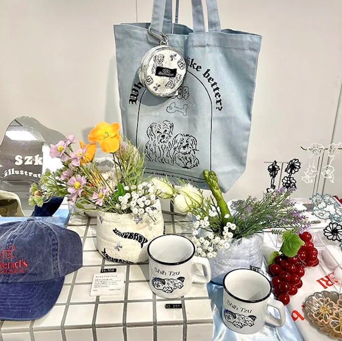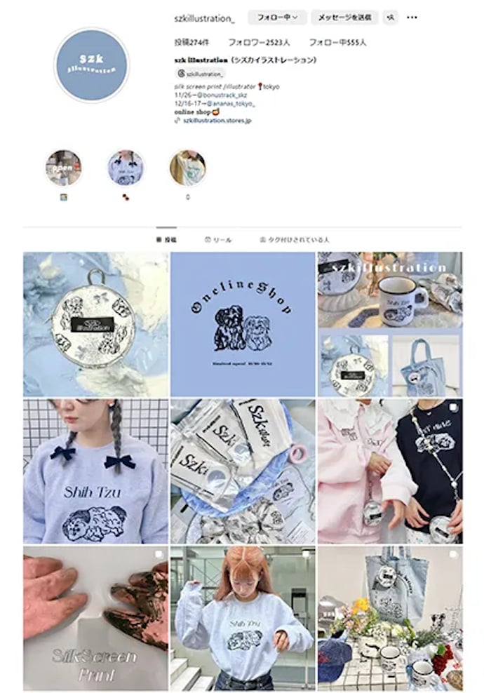 服飾専門学校を卒業し、アパレルブランドのデザイナーとして就職。その後、独学でイラストを学び、イラストレーター「szk illustration」として東京を拠点に活動スタート。たびたび開催しているポップアップでは、Tシャツに好きな文字をプリントできる“シルクスクリーンプリント体験”を実施し、かわいいイラストやユニークな活動で人気を集めている。