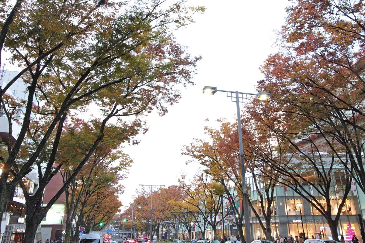 表参道を彩る約900mのケヤキ並木。春夏は緑色の葉に覆われていた木々が、だんだんと黄色や赤のグラデーションに染まっていく姿は見ものだ。直近グッと冷え込んで、だいぶ紅葉が進んできた感じ。ハイブランドショップやレストランが立ち並ぶ、都会的な風景とのコントラストも特徴的。