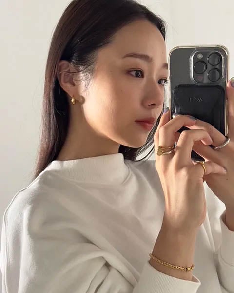 例えば、ゴールドチェーンのバッグやブラウンのシューズで、ワンポイントだけアクセントをつけたり、太めのネックレスに華奢なピアスを合わせて、アクセサリーで全体のバランスを整えたりしています。