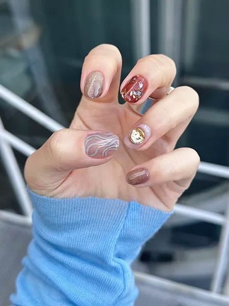赤は1本入っているだけで秋冬っぽさも出て全体の雰囲気を締めてくれるので、5本バラバラのアートにする時は赤を入れるのがおすすめですよ。