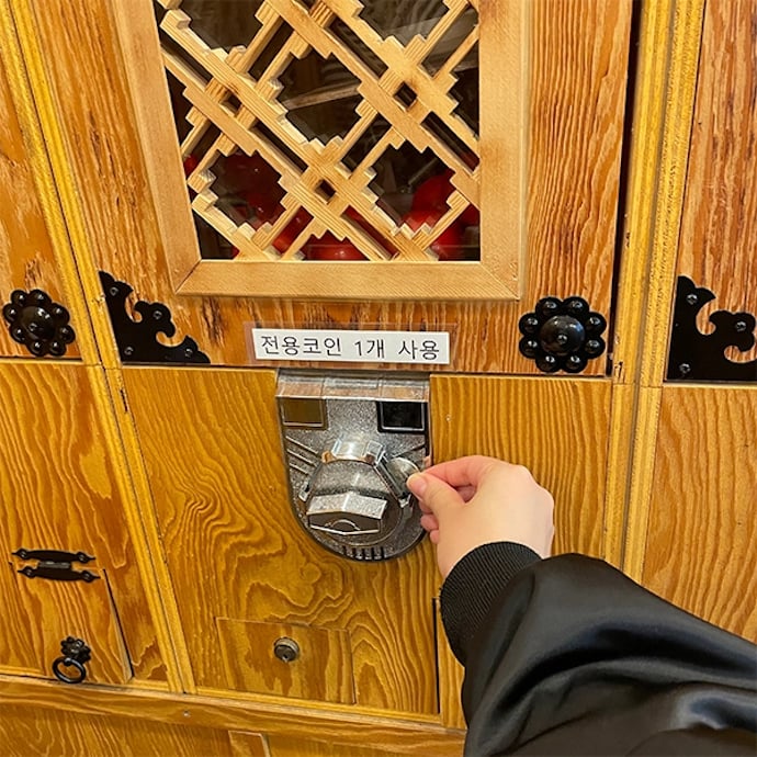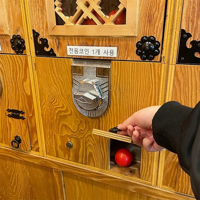 まずは左右の柱にある自動販売機で、おみくじを引く専用のコインを1回分(1000ウォン)購入。