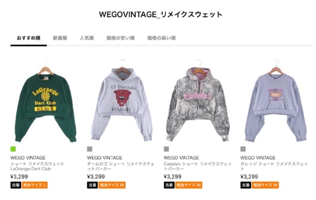 WEGOは今年からリメイク古着の販売を本格化させた。これまでは袖や裾に汚れがあってそのままでは販売できないものをノースリーブにしたり、裾をカットして販売していた。それらのリメイク古着が人気だったことで、この春夏からはそのままでは販売に適さないものの袖、身頃、ディテールなど使える部分を活用。新しいデザインのリメイク古着に作り変え、販売を始めたのだ。