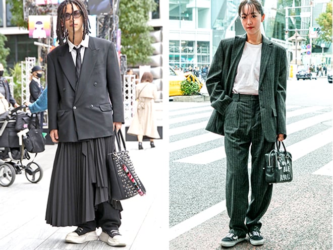 左:お父さんからのお下がりのジャケットパンツでフォーマルに。専門学校の面接に行ってきたという高校生(渋谷)。右:ザラ×アーダーエラーのセットアップのアパレルPRの女性。「ガールズグループのXGにハマっている」とのこと。先日の"VOGUE ALIVE"では、XGのプロデューサーSIMONさんとライターの竹田ダニエルさんのトークイベントが開催され大盛況でした。