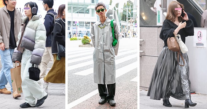 (写真左から)韓国発ブランドThe Open Product(ザオープン プロダクト)のショート丈のダウンJKはBLACK PINKのジェニーが着用していたものだそう。マットな質感のシルバーに薄く色が入ったようなニュアンスカラーがフューチャリスティックな印象(新宿)/大阪の人気ショップの東京店「ゴッファエックス」で購入した古着のシルバーコートを着用していた大学生。パンツはボッテガヴェネタ、サンダルはナイキ×マシューウィリアムズとファッションが大好きで、将来はファッションで海外に行きたい!と話してくれました。詳細はインタビューをどうぞ(原宿)/プリーツ加工が施されたシルバーのロングスカートは比較的コンサバ層〜大人の女性に散見された(新宿)。