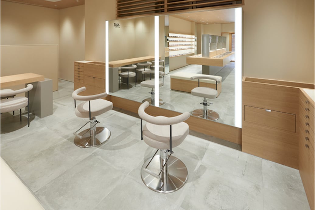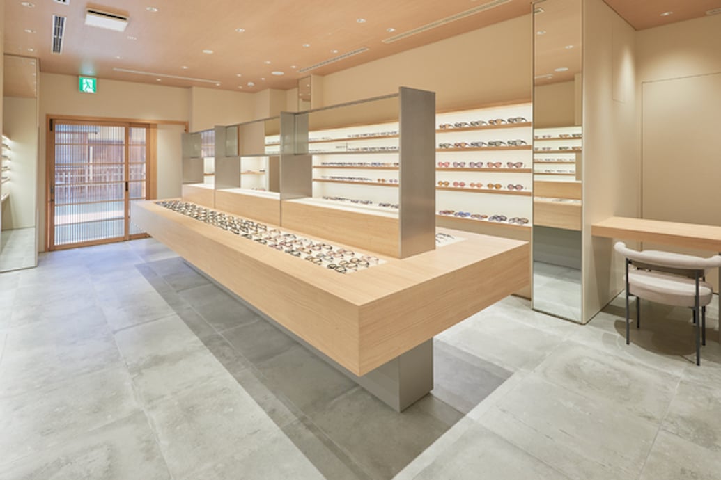 京都 祇園エリア初の路面店となる同店では、豊富なラインナップとともに、最新測定機器も取り揃えている。明るい木目調の店内でゆったりフレーム選びを楽しんで。