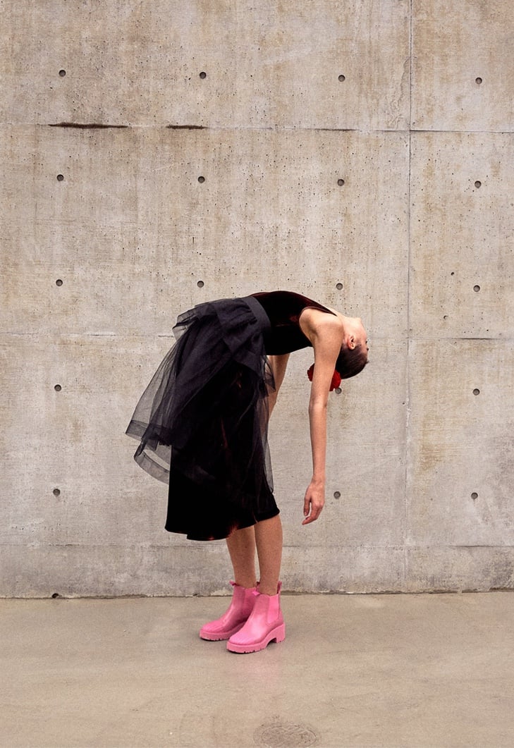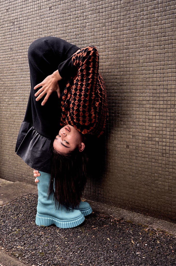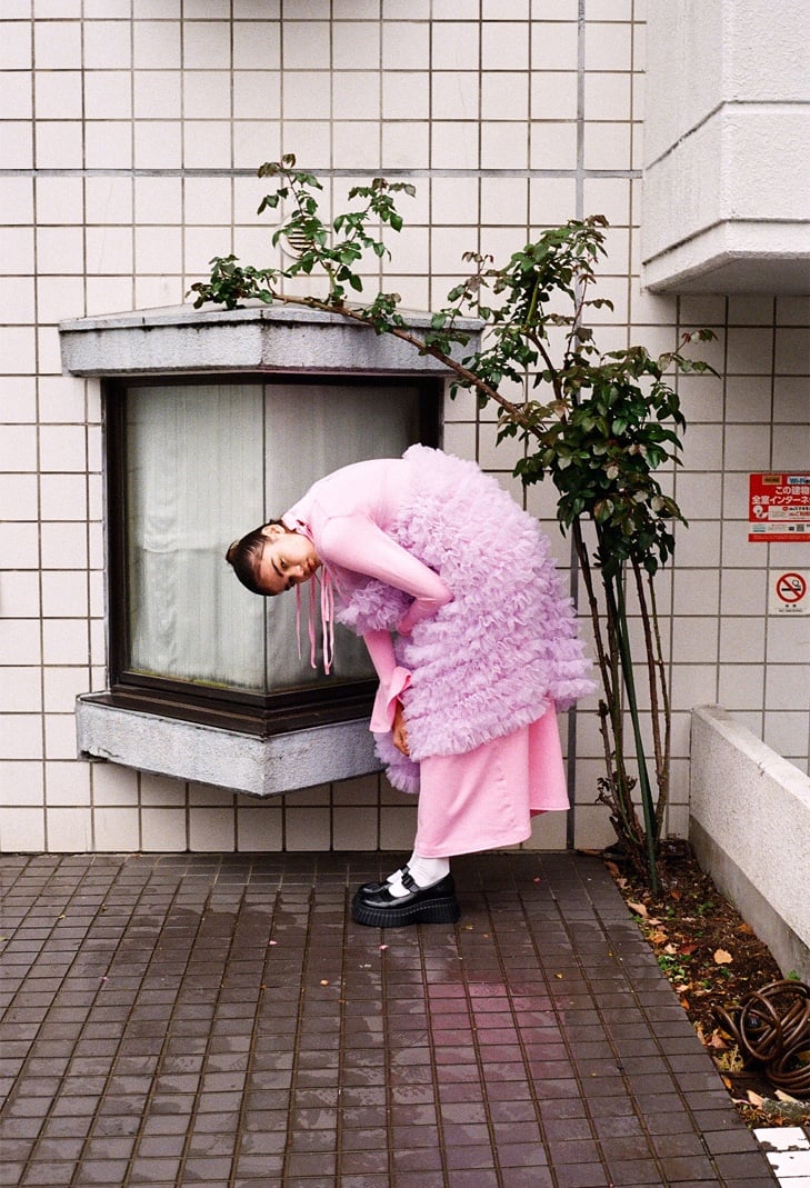 dress by OPEN SESAME CLUB, body suit by SIMONE WILD, socks by JAN/F/CHODOROWICZ, shoes by CAMPER