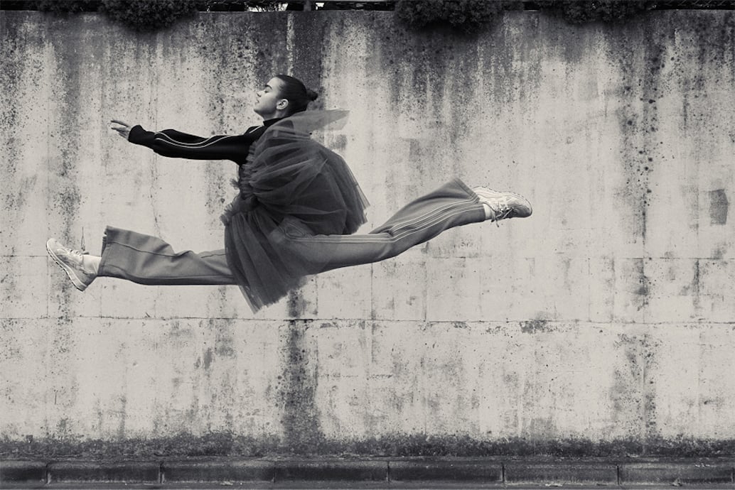 テーマは順応と変化。窮屈な体制から徐々にジャンプへと解き放たれていくポーズの変化は、自分の足場をゆっくりと見つけ、新しいホームで帰属意識を作っていく感覚を表現しています。