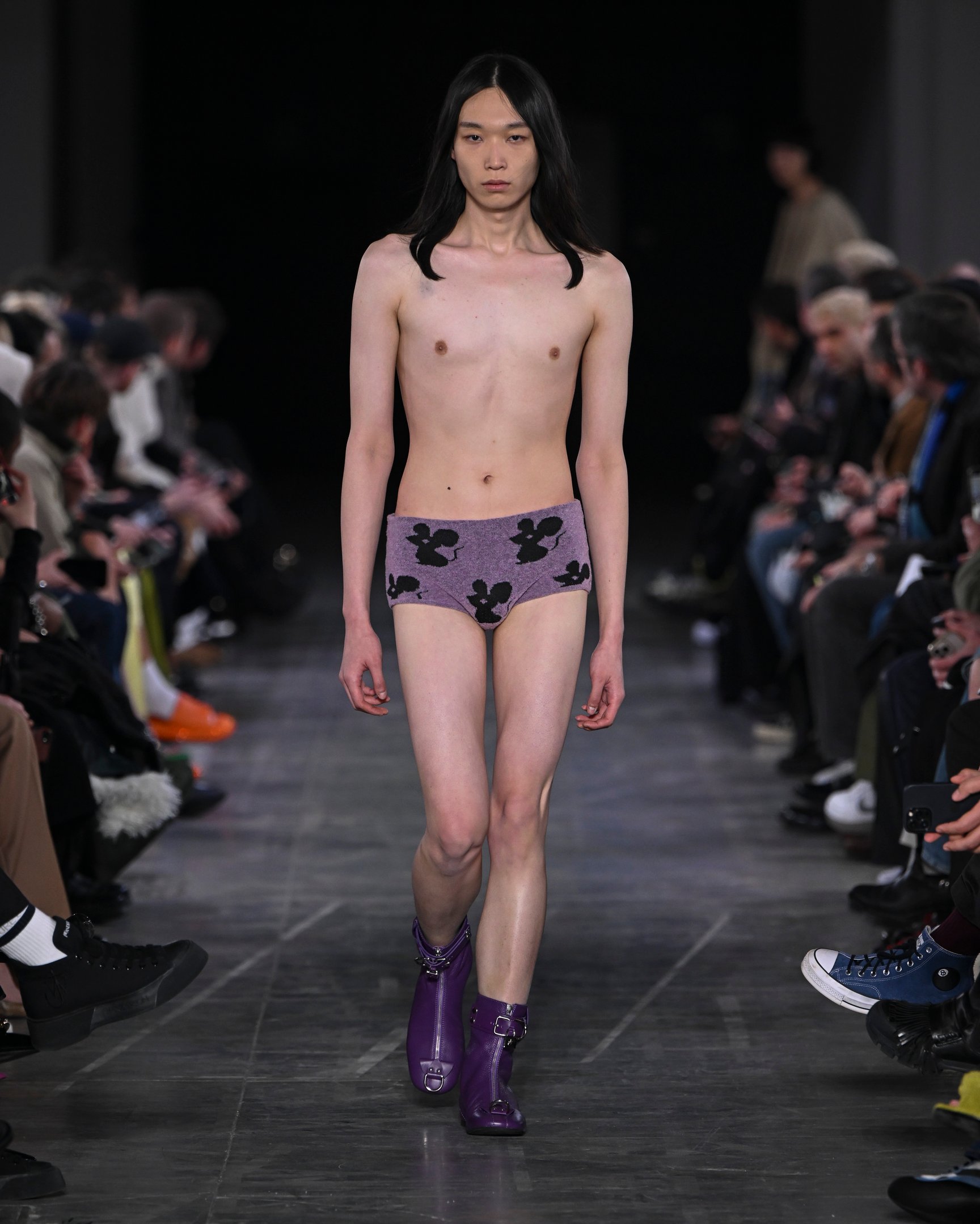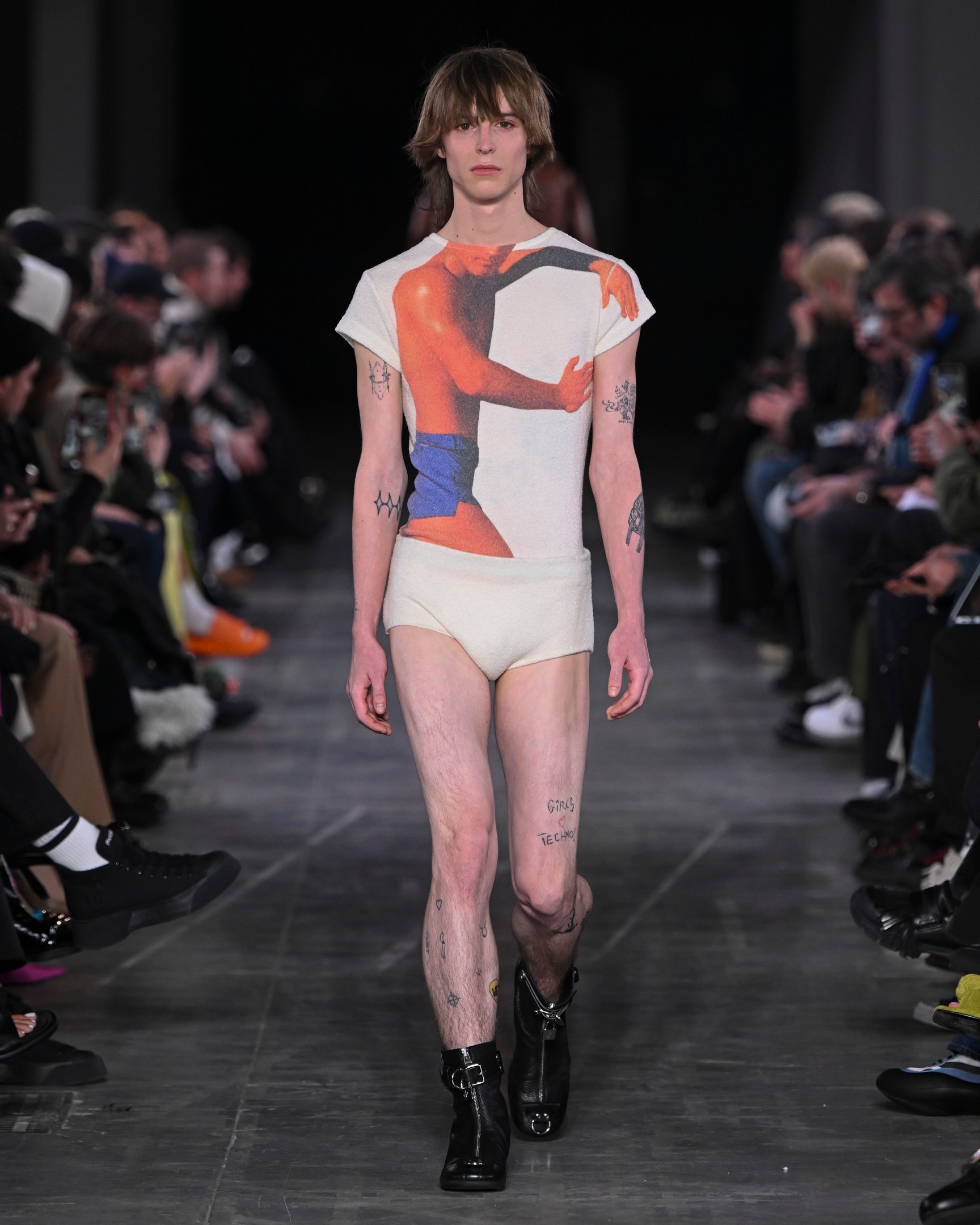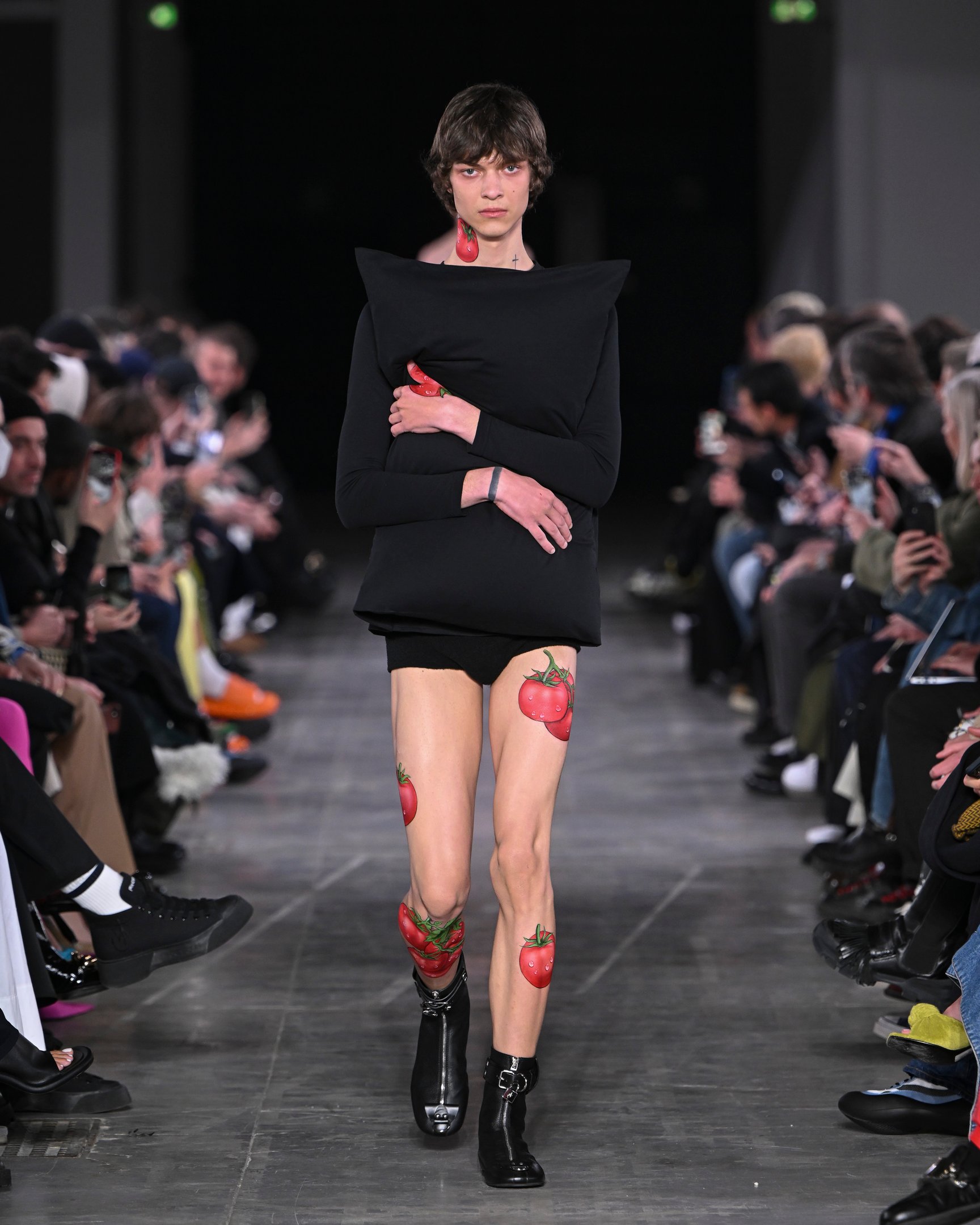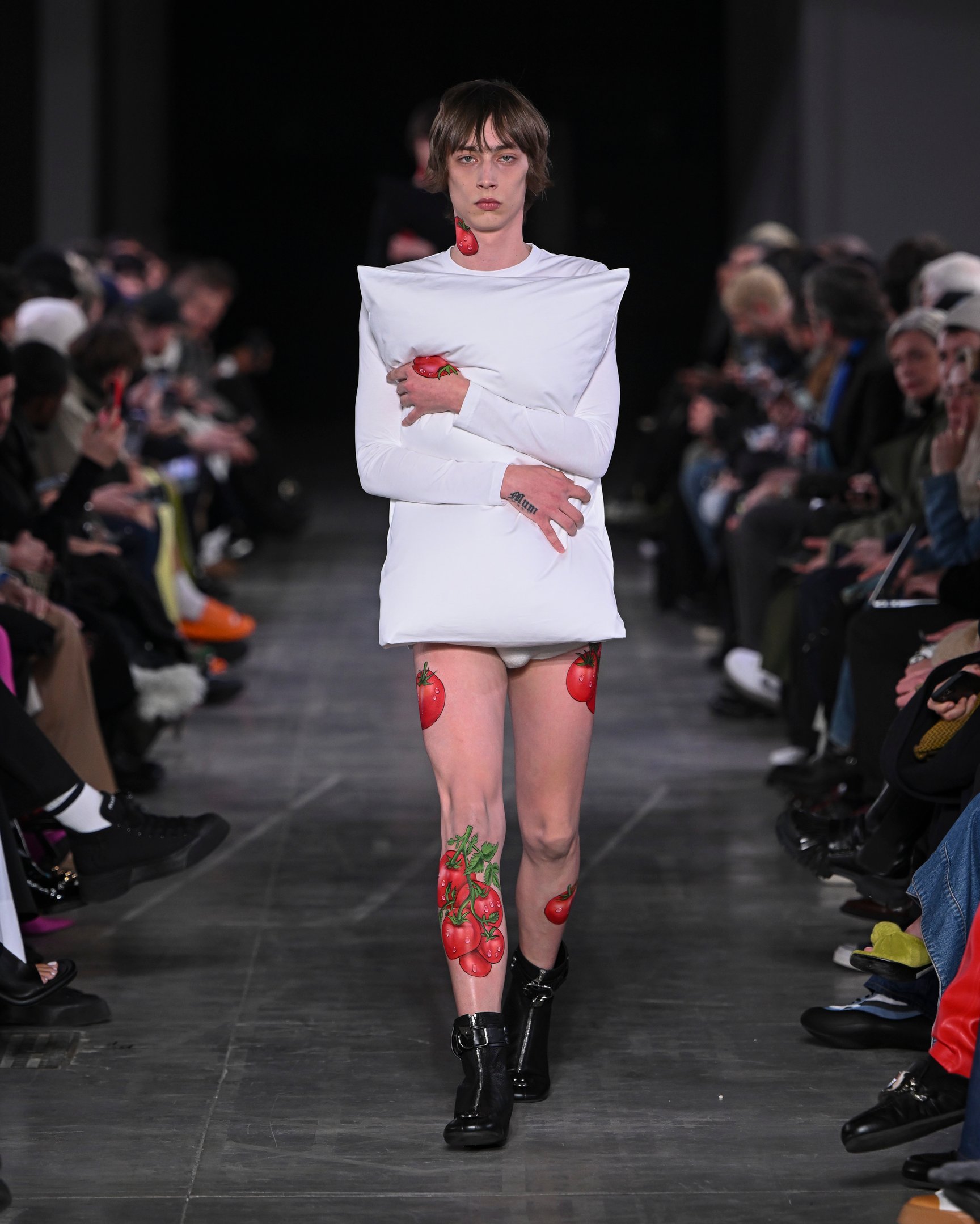 続いて登場したのは、枕を抱き抱えたモデルたち。家庭や幼少期の思い出から得られる親密さや安心感を表現しており、トマトのボディペイントや、ウサギやネズミが飛び跳ねる柄のショーツなども無垢な少年像を描いている。