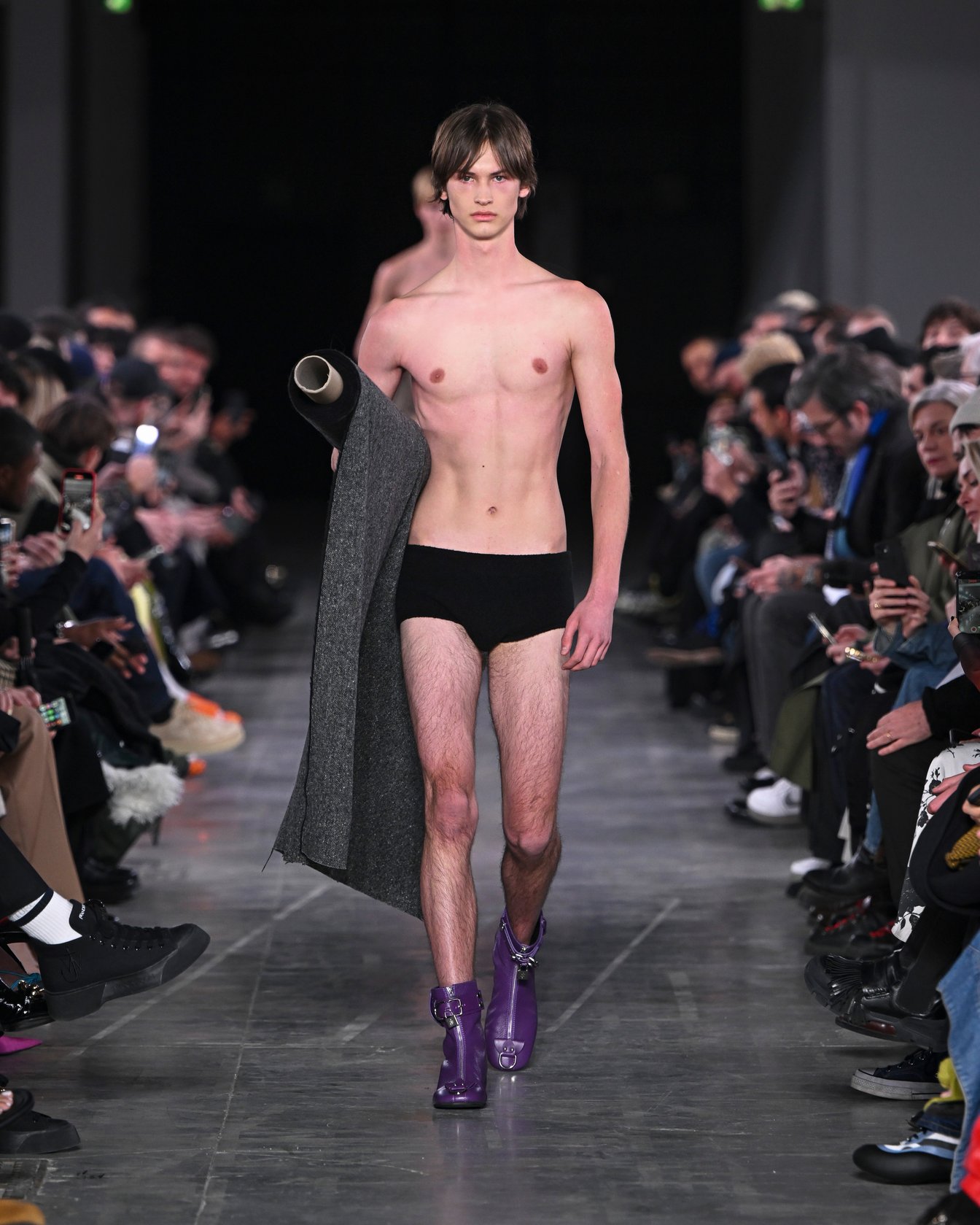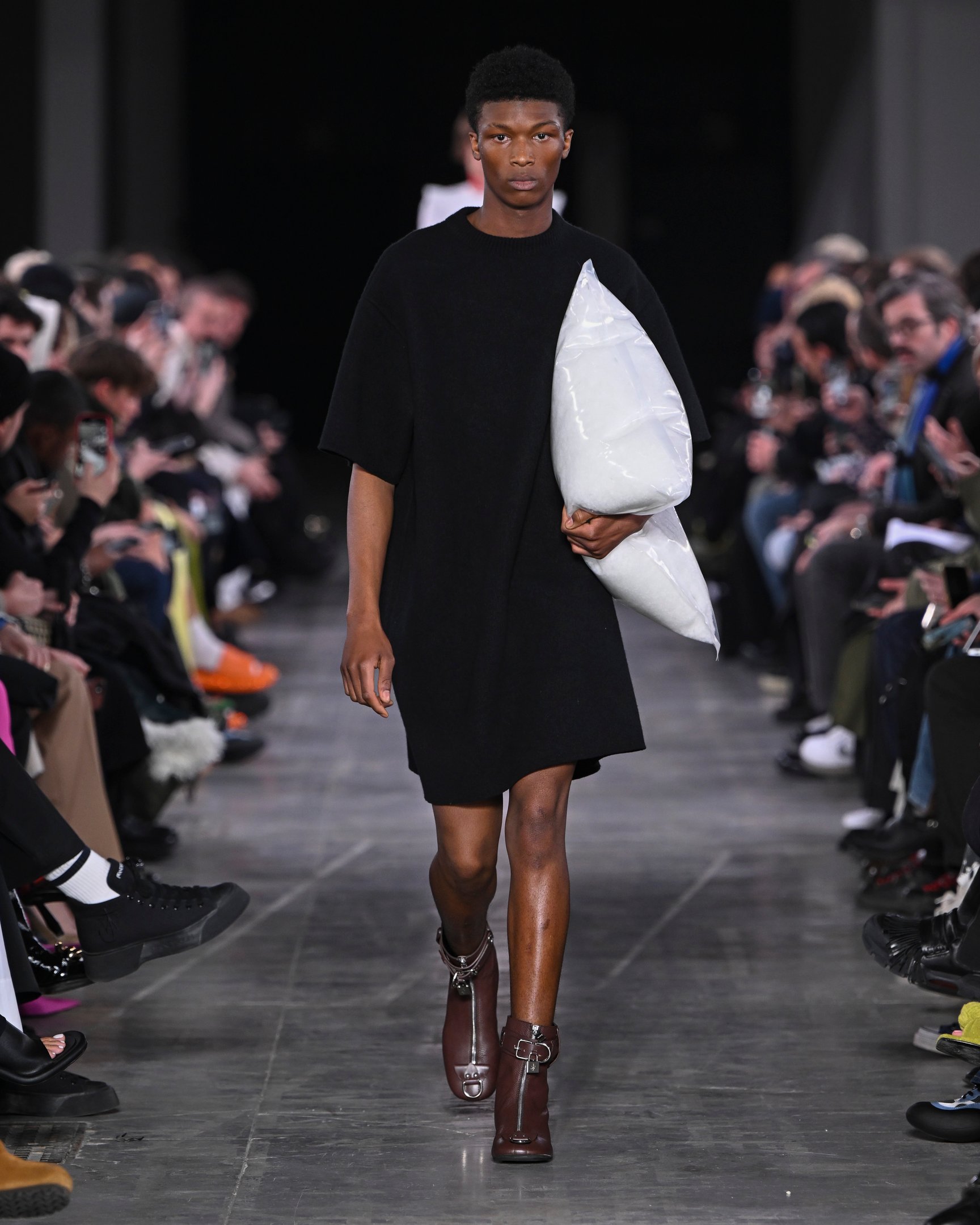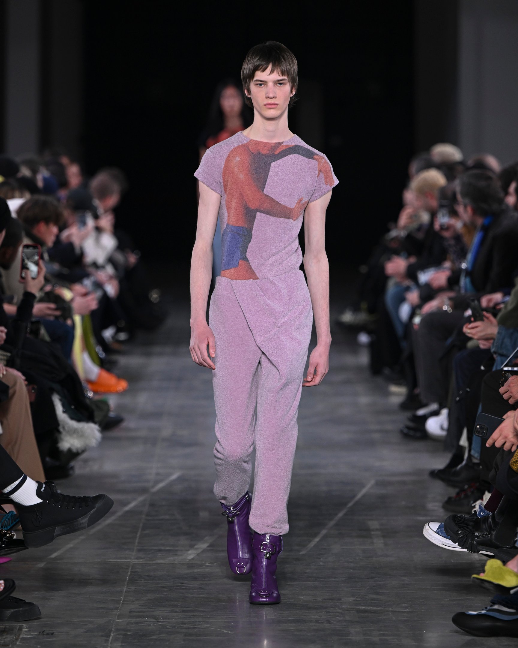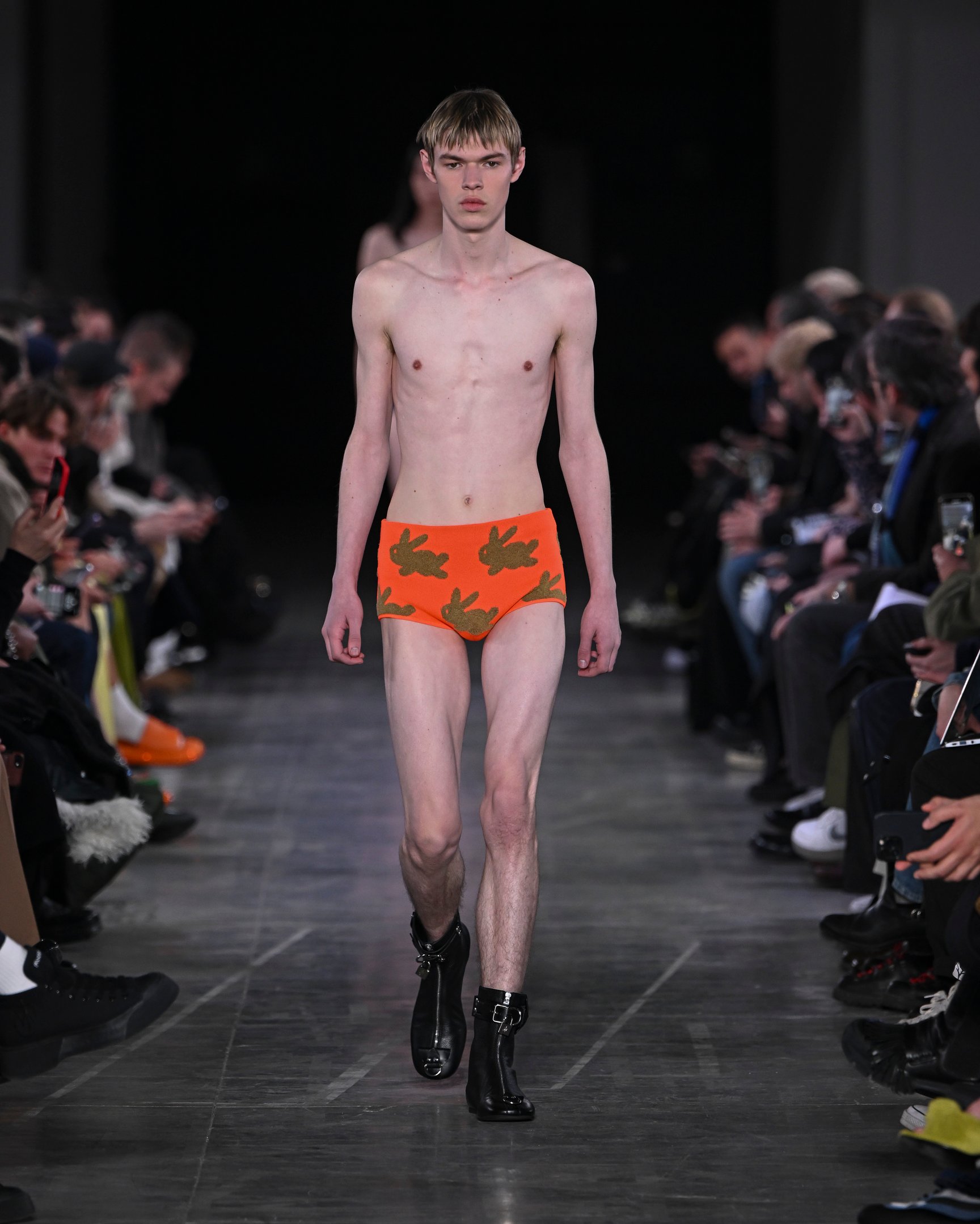 続いて登場したのは、枕を抱き抱えたモデルたち。家庭や幼少期の思い出から得られる親密さや安心感を表現しており、トマトのボディペイントや、ウサギやネズミが飛び跳ねる柄のショーツなども無垢な少年像を描いている。
