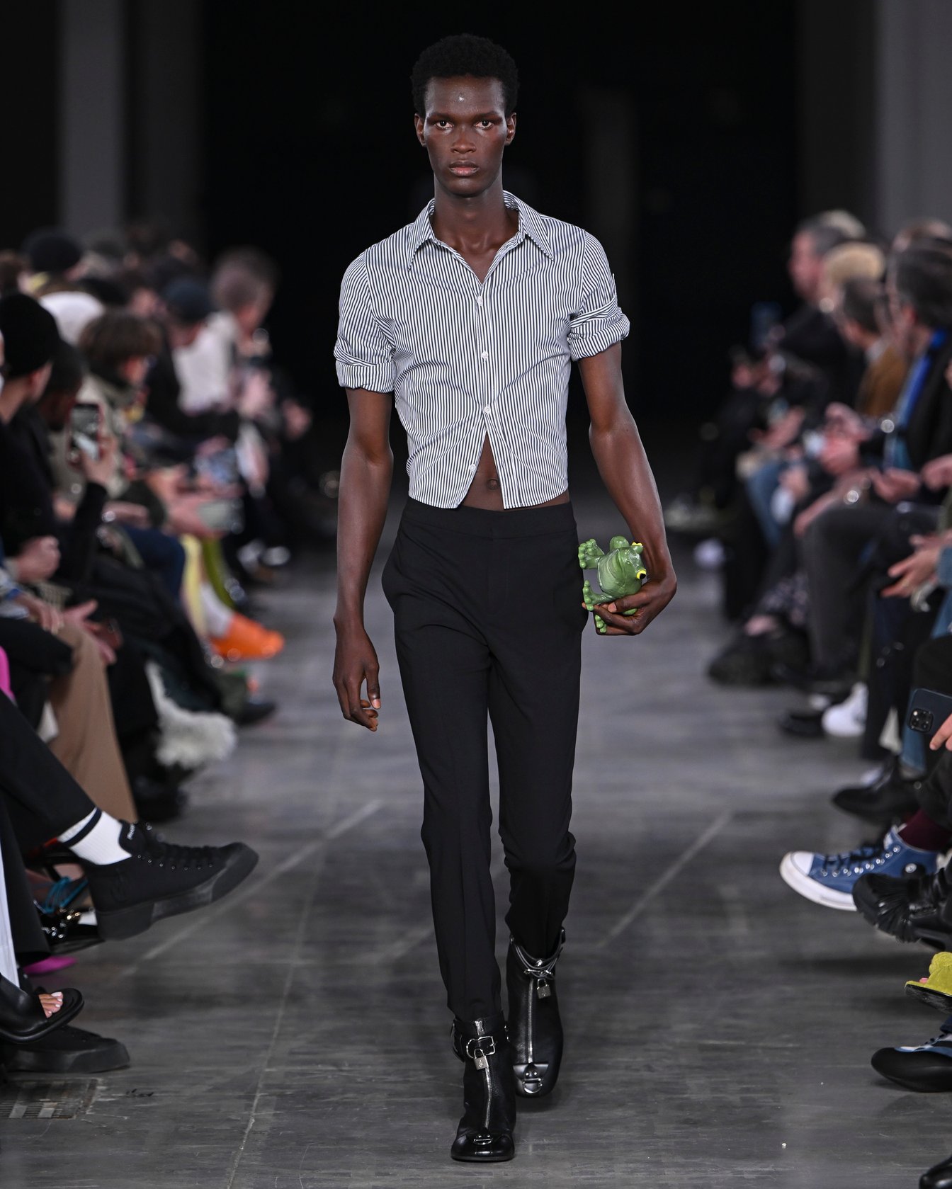ショーの中盤には、カエルのクラッチバッグも登場。2022年秋冬シーズンに発表されたハトのクラッチバッグを彷彿とさせる、遊び心あふれるアイテムとなった。