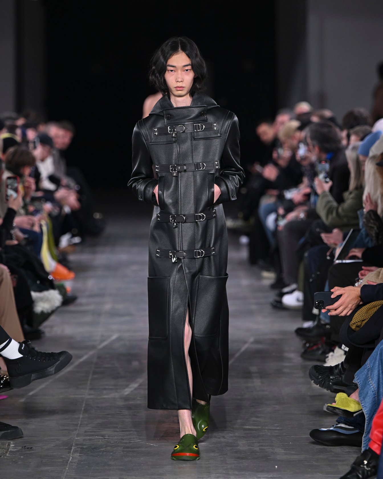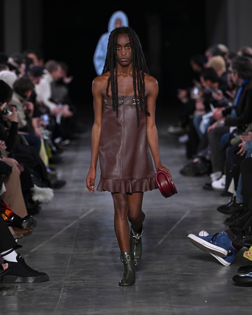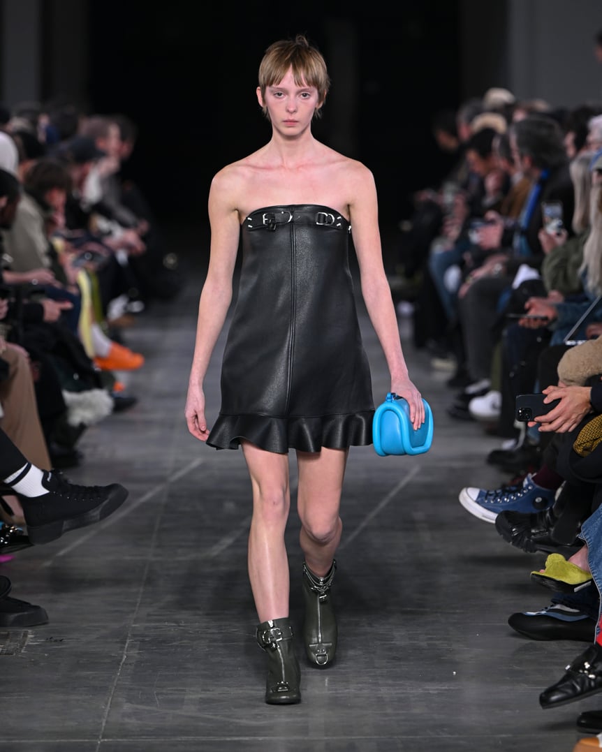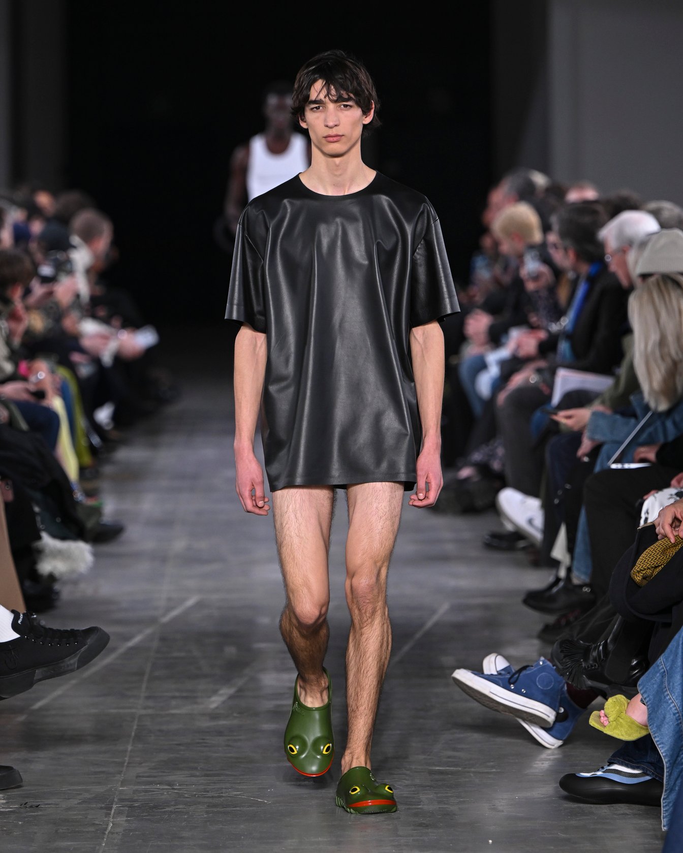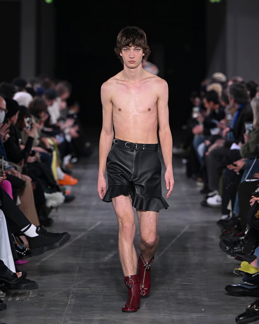 そして、2013年フォールコレクションで披露されたフリルショーツが復活したのも話題の一つ。今回はレザーで登場し、無駄を削ぎ落としたスタイリングに。ベアショルダーのフリルドレスはウィメンズでも展開。10年の時を経て、今もジョナサンの“ジェンダーニュートラル”の哲学がブレていないことを印象付けた。