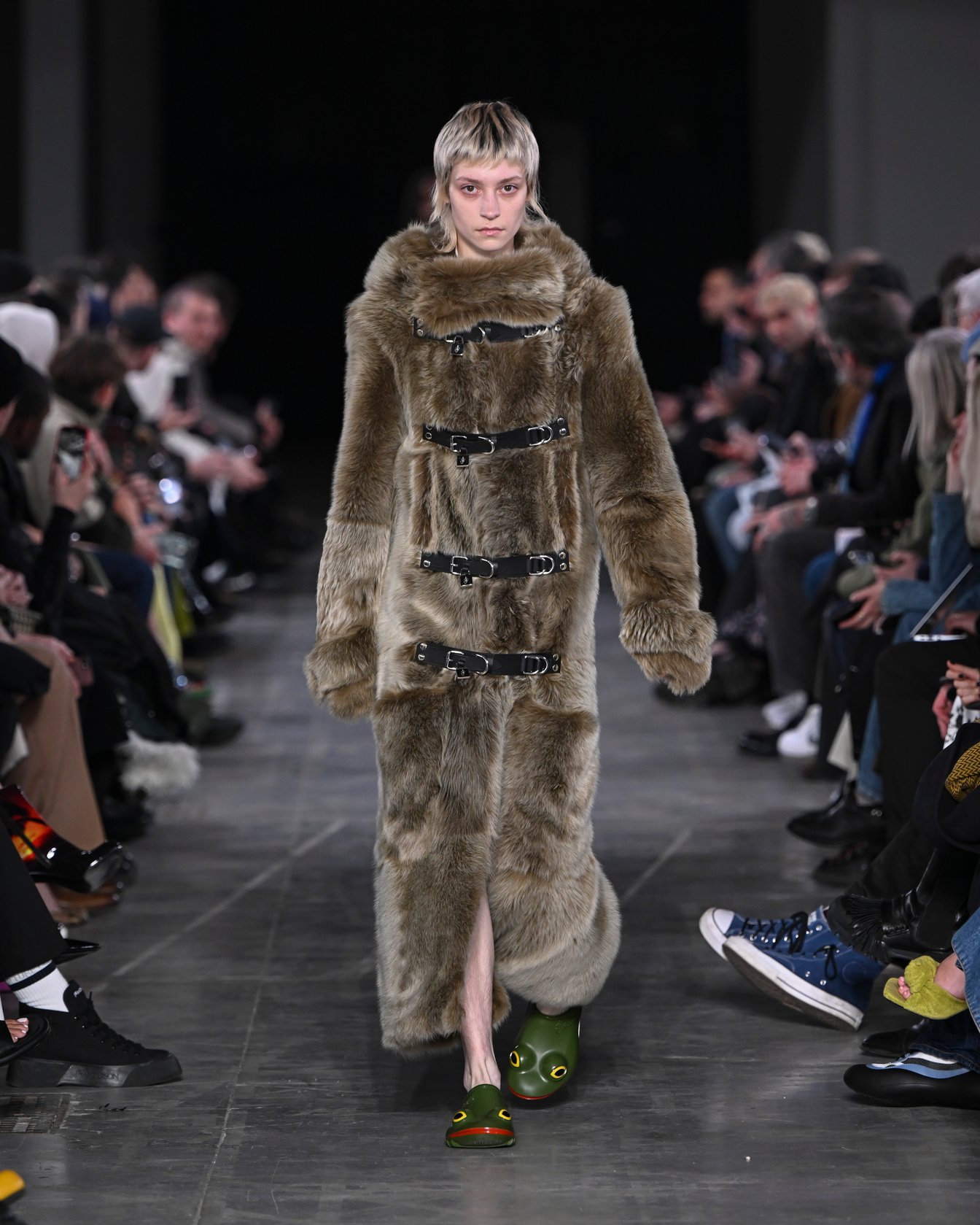 また、特に注目を集めたのがイギリスのレインブーツブランド「ウェリペッツ(Wellipets)」とのコラボレーション。カエルの顔を模ったキッズ用の定番商品をサンダルとブーツに落とし込み、足元にユーモラスなツイストを加えた。