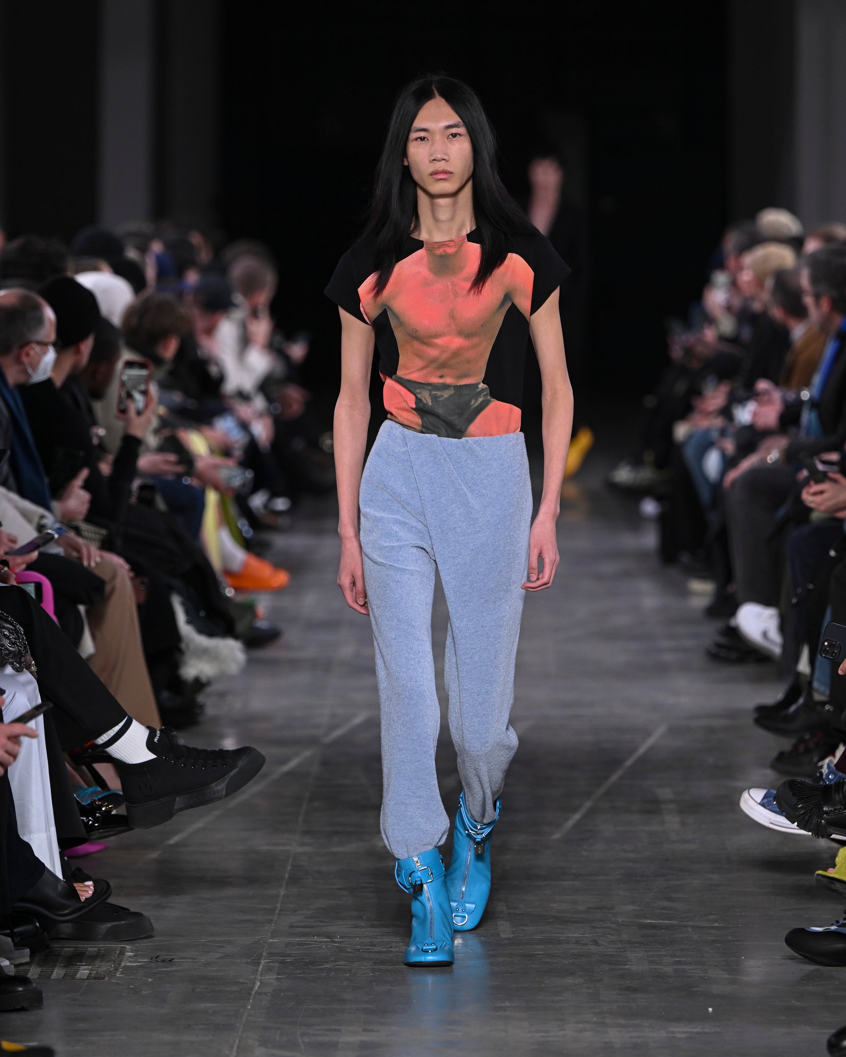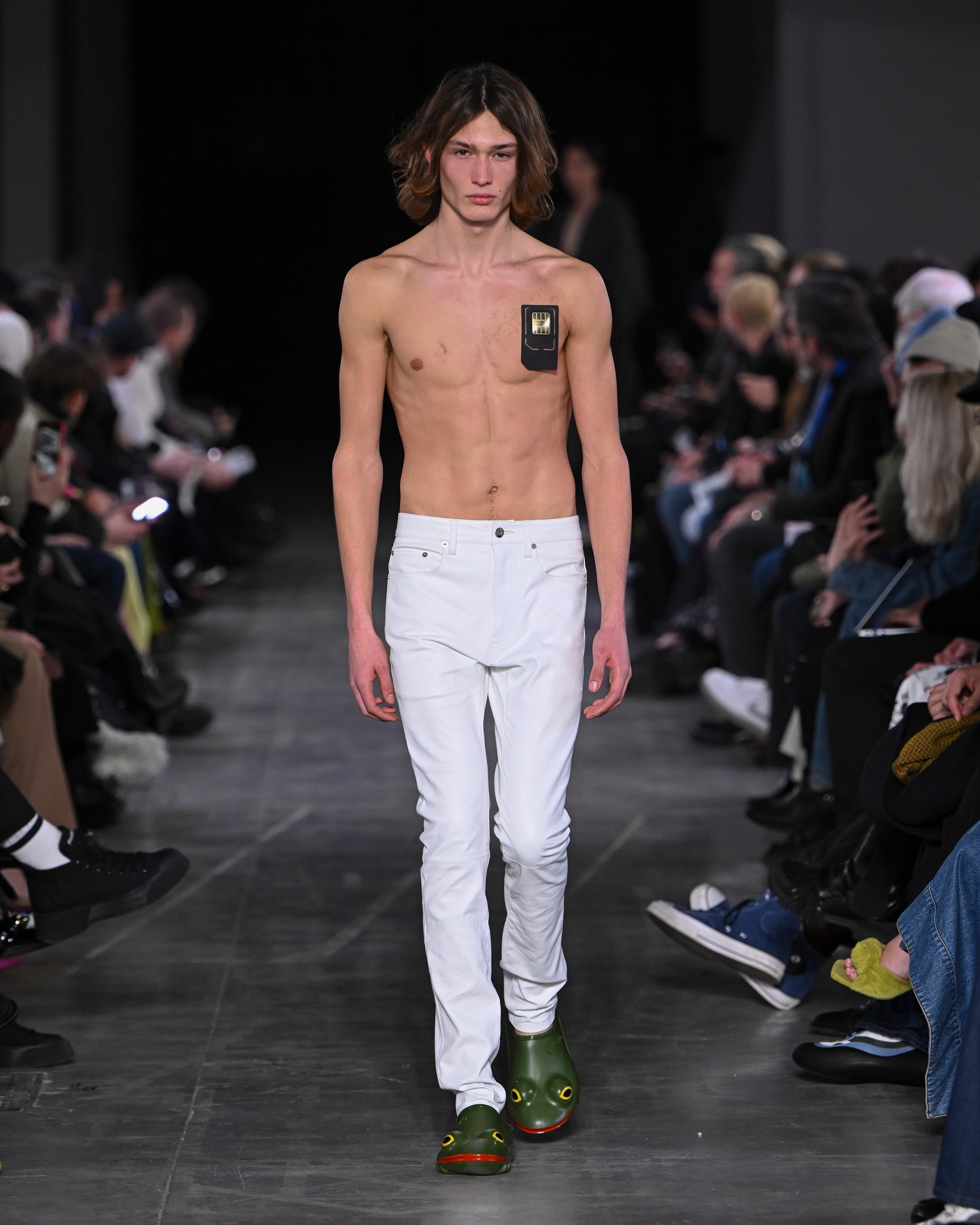 そのほか、マッチョな男性の身体をプリントしたトロンプルイユ風のTシャツや、レザーで作られたSIMカードのモチーフを胸元に貼り付けたルックなど、ジョナサンならではの意味深なクリエーションは健在だ。SIMカードのモチーフはレザー製で、タンクトップのワンポイントにも取り入れられた。