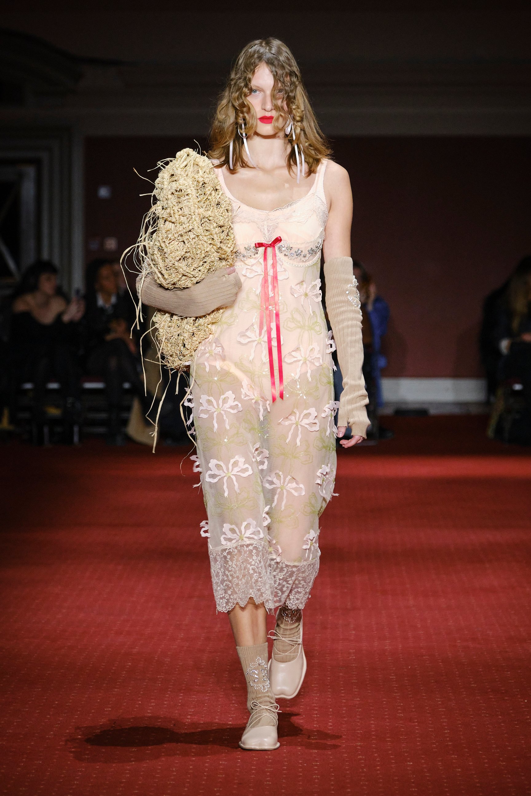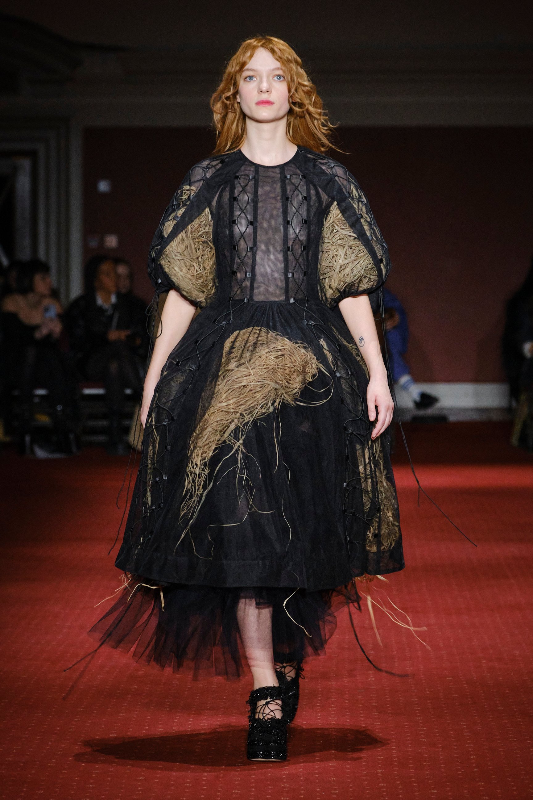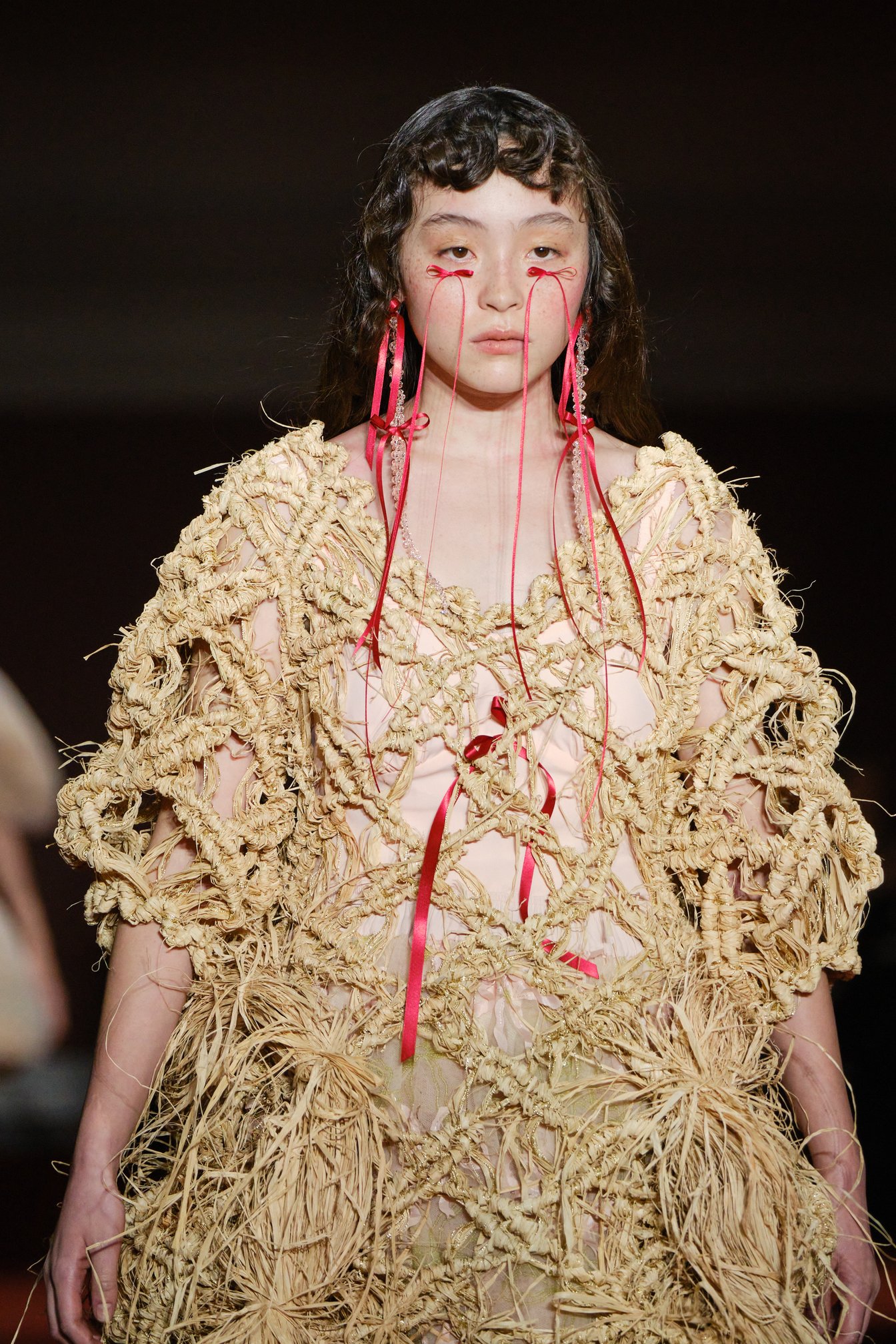 「シモーン・ロシャ(Simone Rocha)」はウェストミンスターメソジスト教会でショーを発表した。会場にはブラッドレッドの絨毯が敷き詰められ、ケルトの音楽に合わせて中央階段からモデルたちが降りてくる。インスピレーション源となったのは、シモーンの故郷アイルランドで開催される収穫祭「ルグナサド(Lughnasadh)」。細く垂れ下がる赤いリボンは、子供の顔に血を塗って悪霊を追い払うアイルランドの伝統文化を反映したものだという。日本で活躍するモデル モトーラ世理奈も起用され、両目の下や耳、胸元にリボンをあしらったルックでランウェイを歩いた。