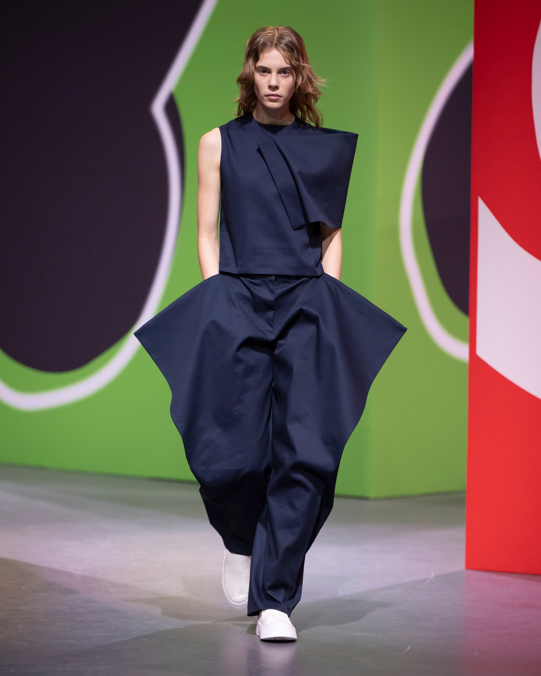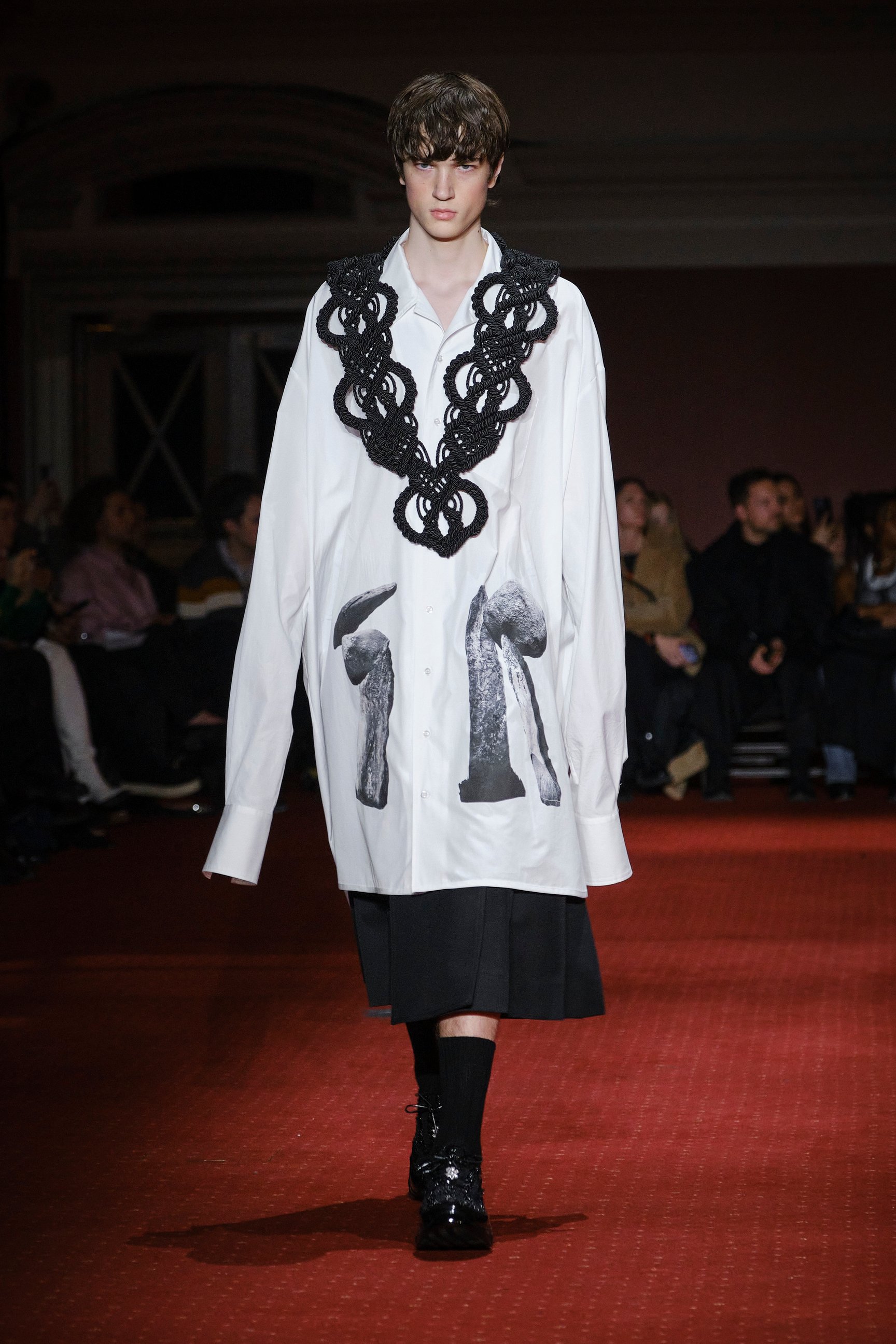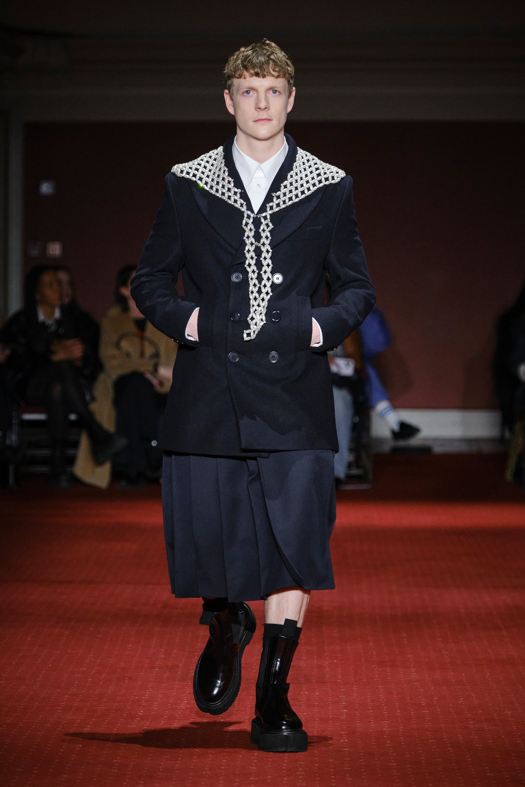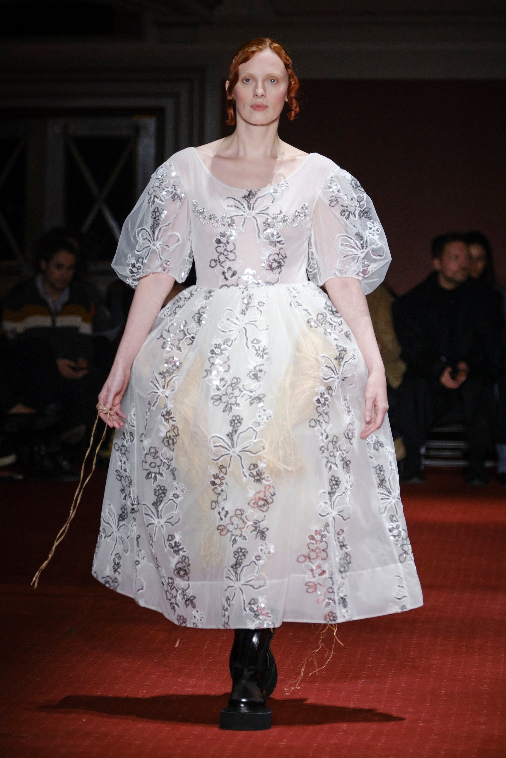 「シモーン・ロシャ(Simone Rocha)」はウェストミンスターメソジスト教会でショーを発表した。会場にはブラッドレッドの絨毯が敷き詰められ、ケルトの音楽に合わせて中央階段からモデルたちが降りてくる。インスピレーション源となったのは、シモーンの故郷アイルランドで開催される収穫祭「ルグナサド(Lughnasadh)」。細く垂れ下がる赤いリボンは、子供の顔に血を塗って悪霊を追い払うアイルランドの伝統文化を反映したものだという。日本で活躍するモデル モトーラ世理奈も起用され、両目の下や耳、胸元にリボンをあしらったルックでランウェイを歩いた。